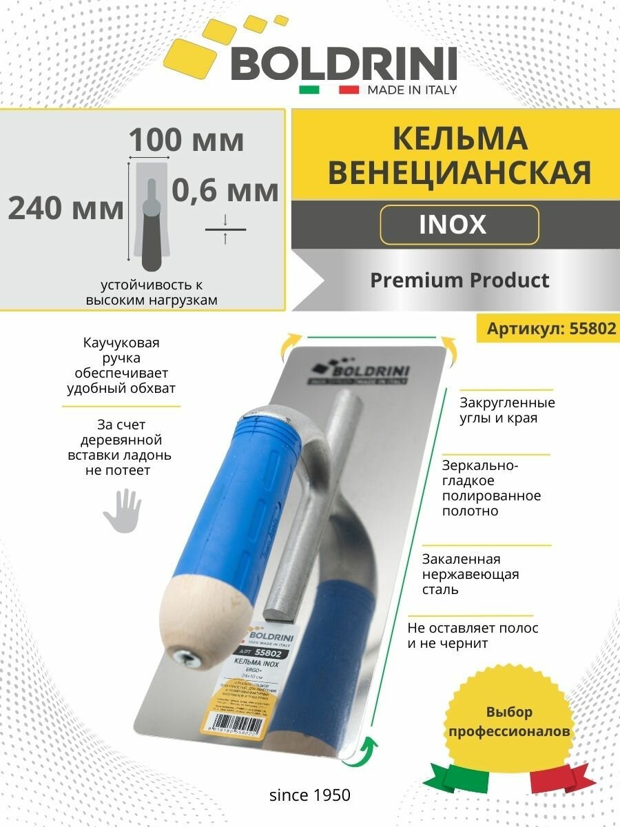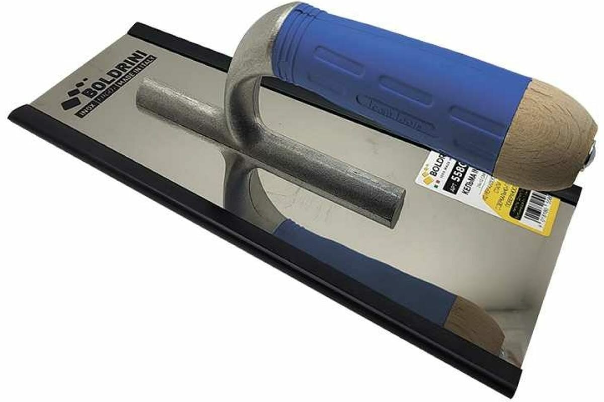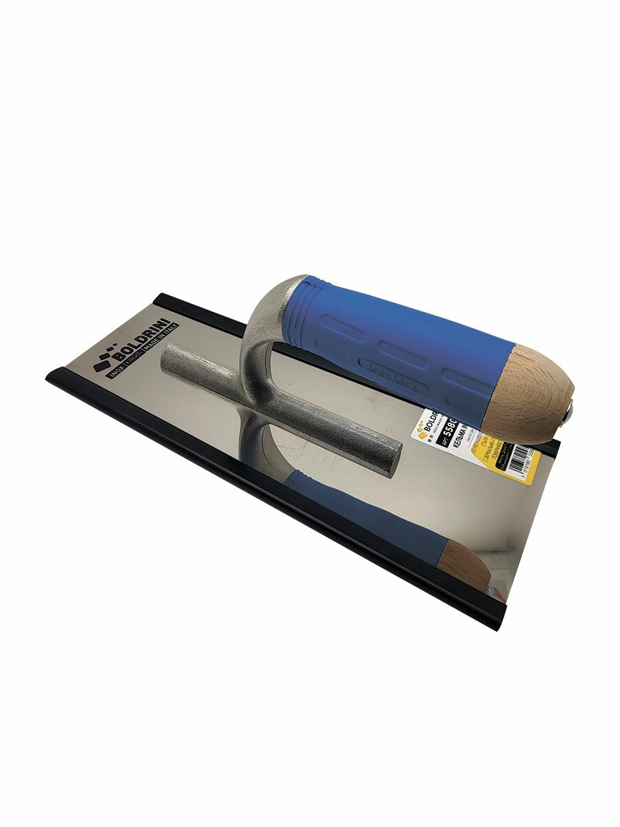 Кельма с зеркально-гладкой поверхностью. Материал: рукоятка - дерево, рабочая часть - нержавеющая сталь. Габариты рабочей части (ДхШ): 240*100 мм. Назначение: для нанесения и полировки венецианских штукатурок и любых других фактурных материалов.