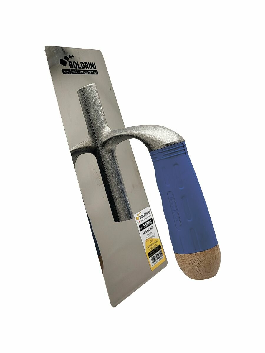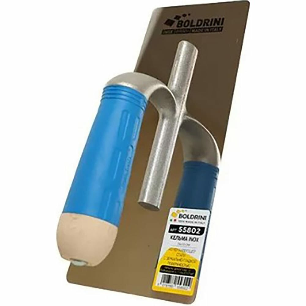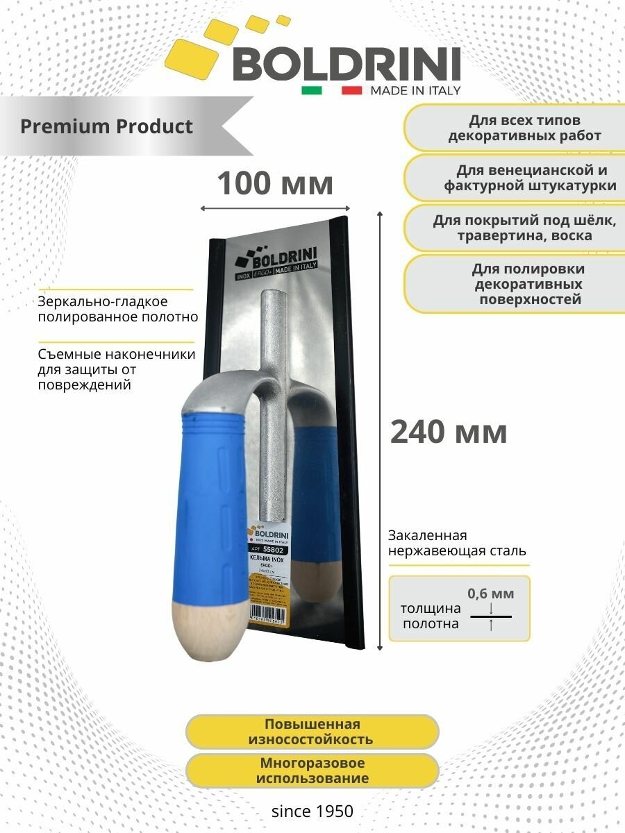Кельма с зеркально-гладкой поверхностью. Материал: рукоятка - дерево, рабочая часть - нержавеющая сталь. Габариты рабочей части (ДхШ): 240*100 мм. Назначение: для нанесения и полировки венецианских штукатурок и любых других фактурных материалов.