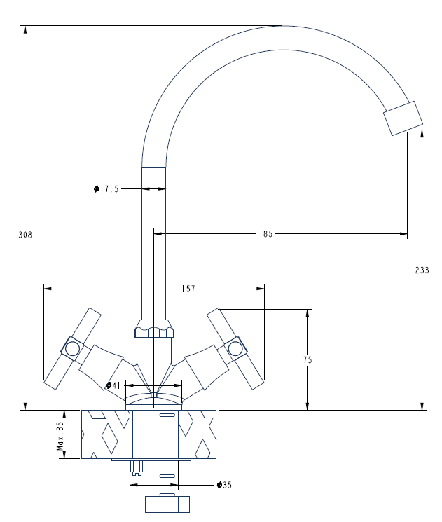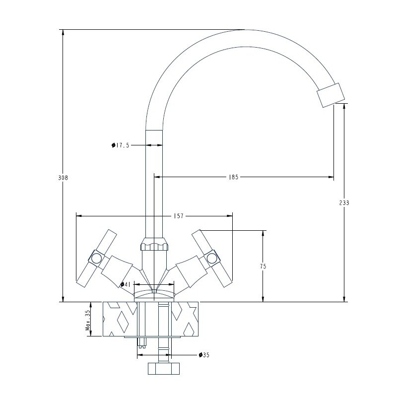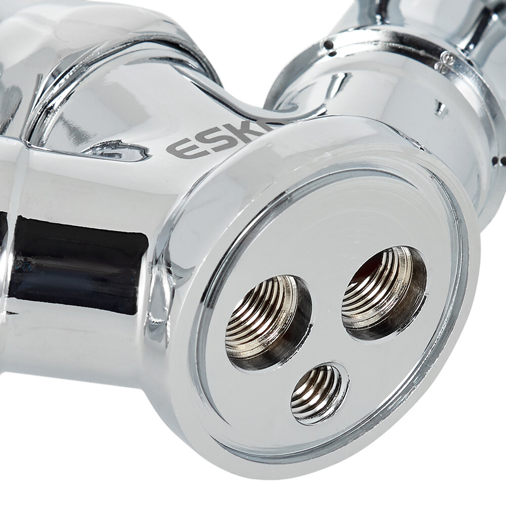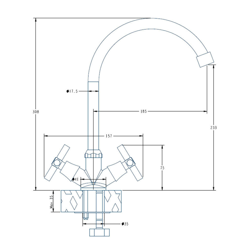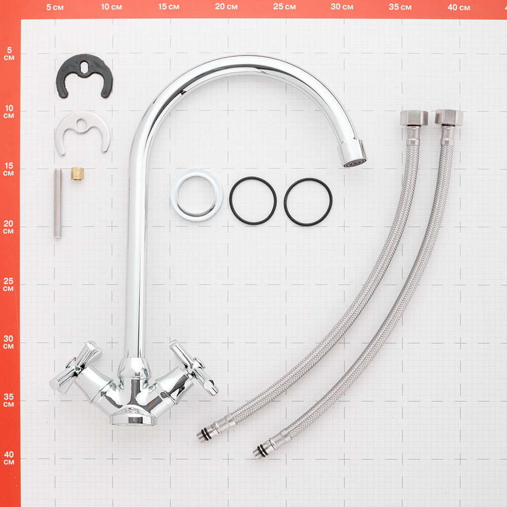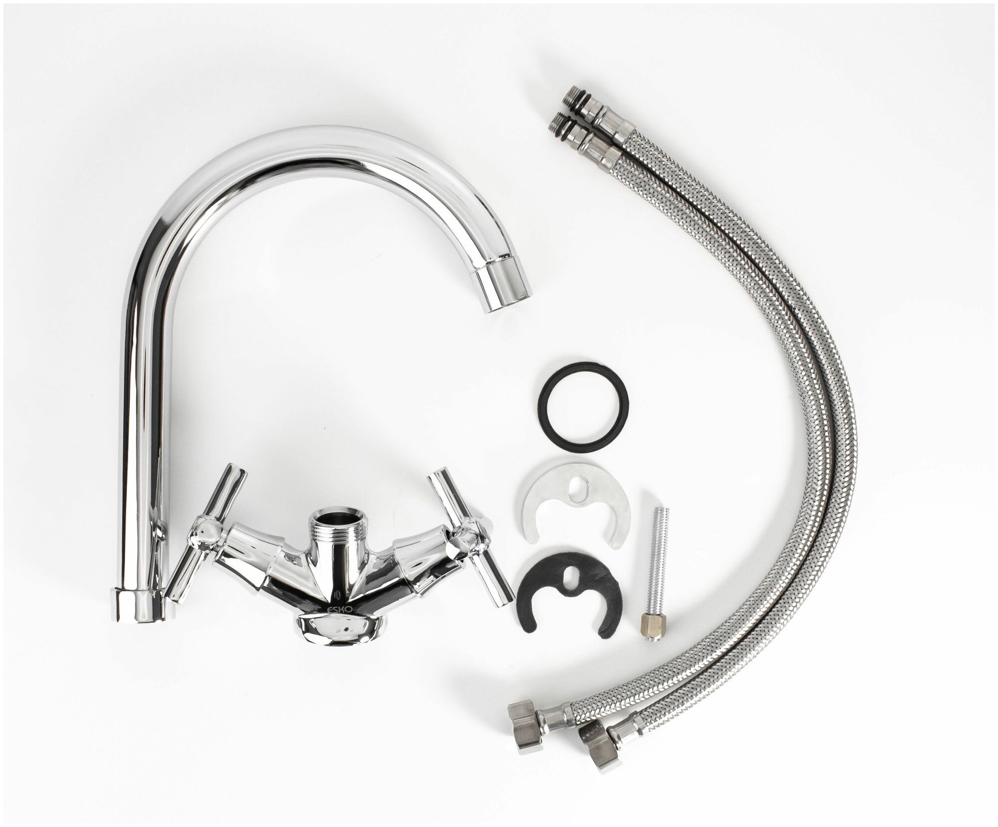 Корпус: латунь кат.A Ручки: с защитой от нагревания Излив: поворотный, нерж.сталь Кран-буксы: универсальные ESKO, ход 180 градусов Комплектация: ребро жесткости, крепление "шпилька", гибкая подводка 35см