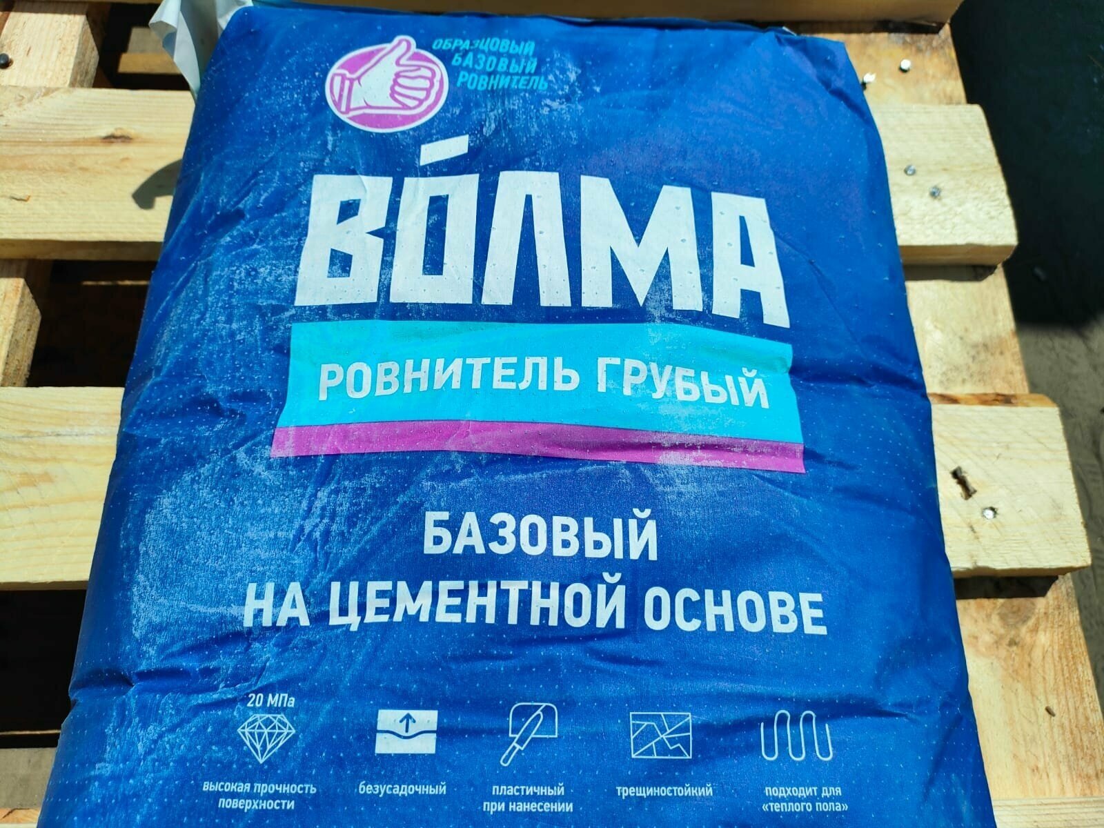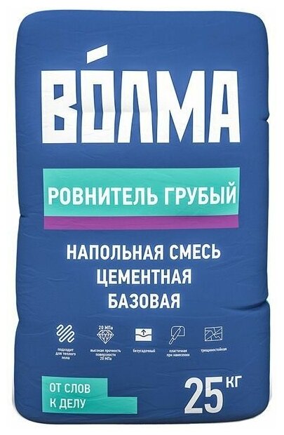 ВОЛМА- - сухая многокомпонентная смесь, изготовлена на основе высококачественного цемента, извести с фракционированными натуральными наполнителями, модифицированная полимерными и химическими добавками, усиленная волокном. Обладает низкой усадкой, высокой прочностью и адгезией с основанием. Пластичная, морозостойкая, легко наносится и разравнивается, шлифуется. Раствор быстро схватывается и набирает прочность, что позволяет ускорить рабочий процесс. Область применения: «ВОЛМА-» - предназначен для первоначального выравнивания бетонных и цементно-песчаных оснований пола, для устройства ровного и прочного основания толщиной от 10 до 80 мм (максимально 100 мм), для ремонта пола (заполнение глубоких трещин и выбоин), а также для придания основанию требуемого уклона. Применяется внутри и снаружи помещений. Способ нанесения - ручной.
