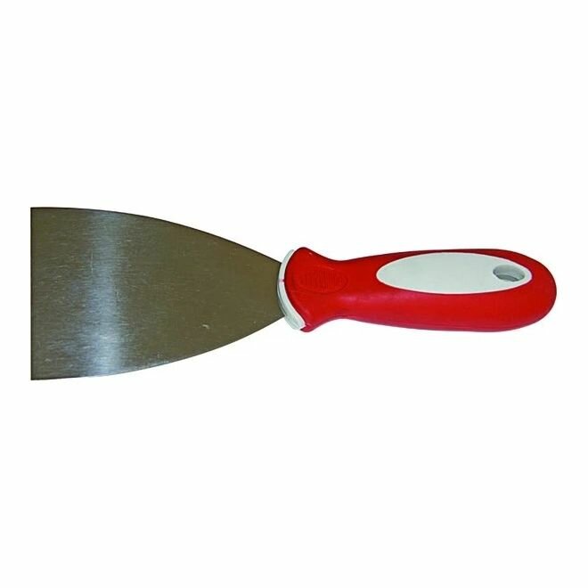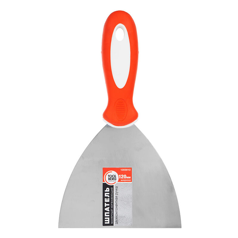 Шпатель малярный 120 мм. Двухкомпонентная ручка. Применяется для нанесения на обрабатываемую поверхность шпатлевки, а также других отделочных растворов, и их выравнивания. Профилированное полотно шпателя изготовлено из высокоуглеродистой нержавеющей стали.