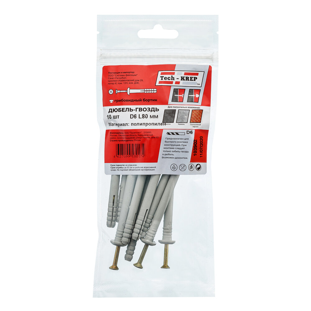 дюбель-гвоздь 6*80 гриб. манжета (полипропилен) /10шт/ Tech-Krep