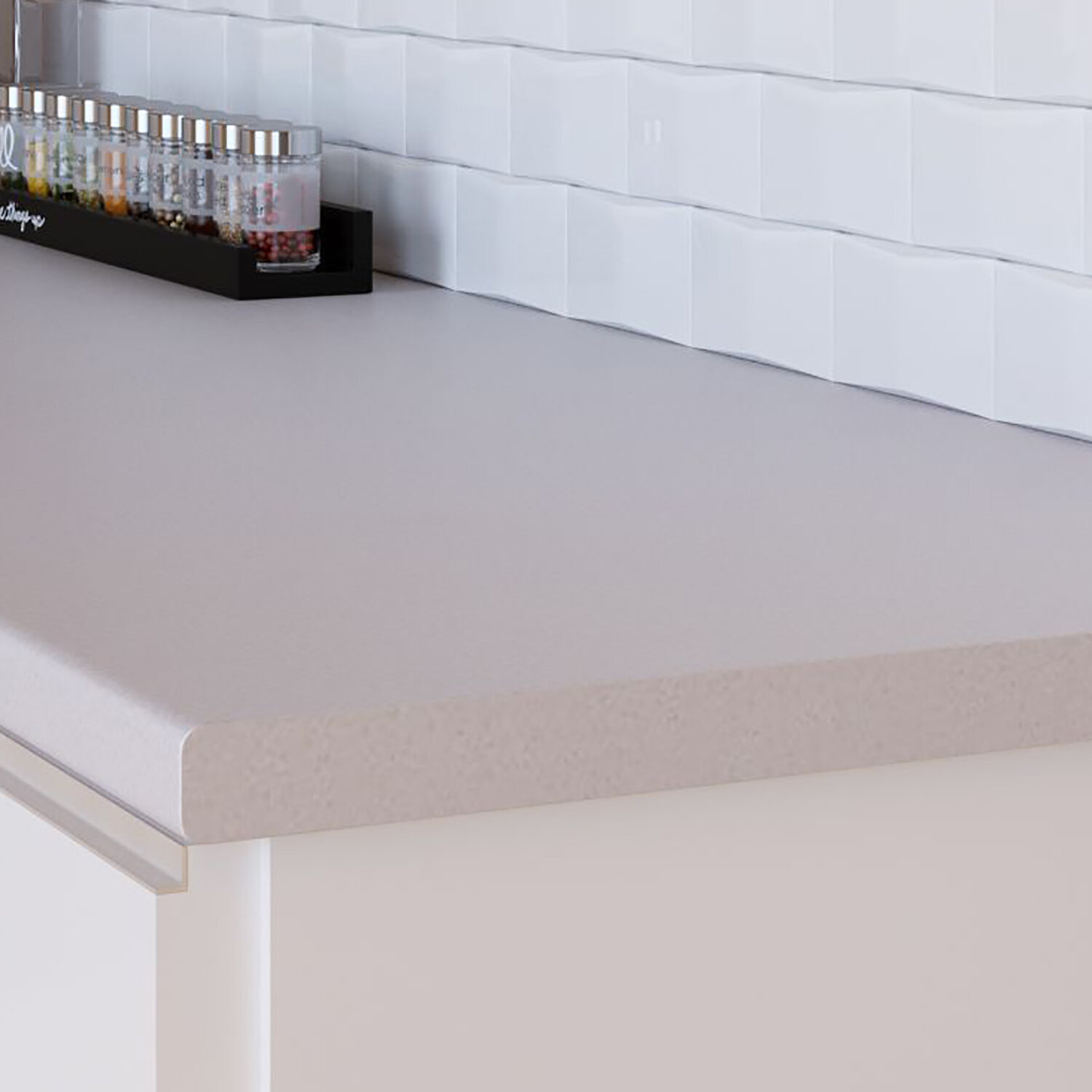 Столешницы изготавливается из плиты ДСП и облицовывается декоративным слоистым пластиком - материал, состоящий из нескольких пропитанных смолой листов целлюлозы, пропитанного меламиновой смолой листа декоративной бумаги и защитного слоя соединенныхвместе под действием давления и температуры.Цвет светло-серый с вкраплениями мраморной крошки.