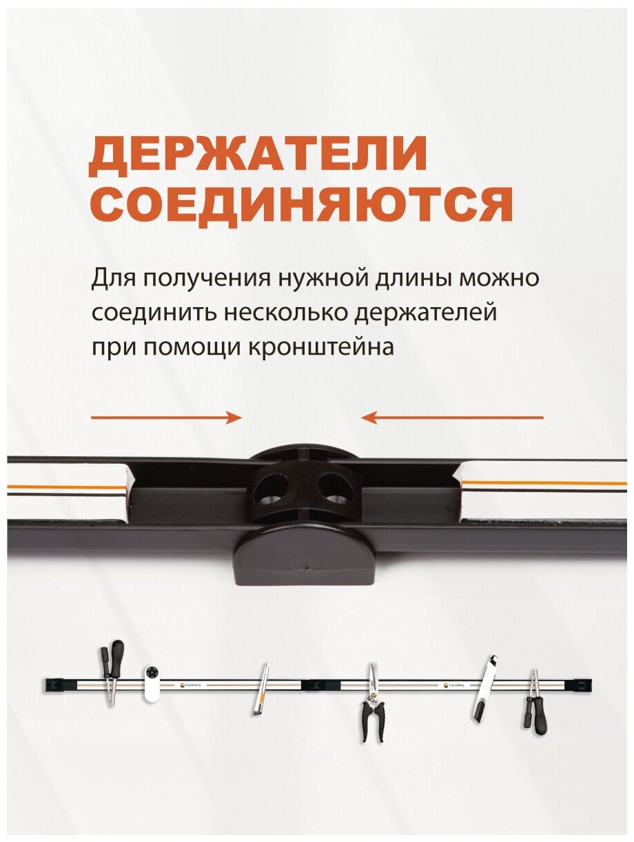 Магнитное приспособление предназначено для удерживания разнообразных металлических инструментов. Его длина составляет 5000 мм, а вес — 780 г. При этом он обеспечивает силу сцепления до 5 кг. Форма и характеристики магнитного держателя делают его идеальным вариантом для монтажа: