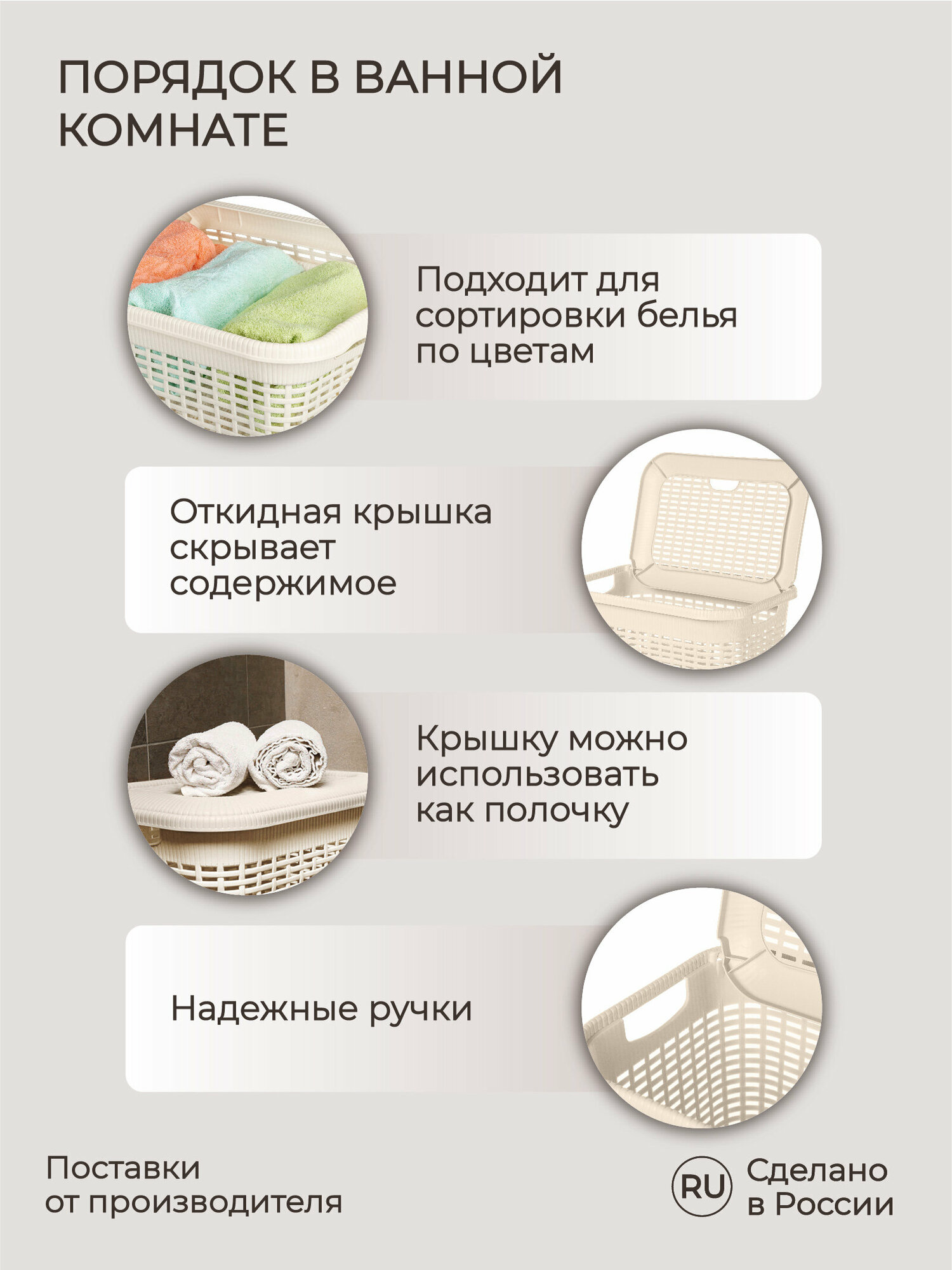 Корзина для белья, стилизованная под натуральный ротанг, гармонично впишется в ванную комнату. Для удобства переноски по бокам корзины предусмотрены специальные отверстия. Крышка скрывает содержимое корзины от посторонних глаз, а также может служить дополнительным местом для хранения легких туалетных принадлежностей. Корзина изготавливается из прочного и долговечного полипропилена, отвечающего требованиям влажного помещения. Естественные нейтральные цвета и приятная фактура делают корзину эстетически привлекательным дополнением интерьера ванной комнаты.