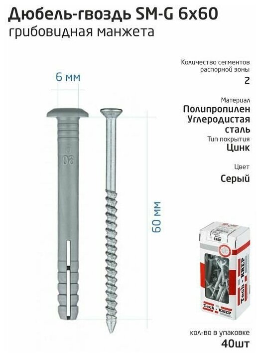 дюбель-гвоздь 6*60 гриб. манжета (полипропилен) /40шт/ Tech-Krep