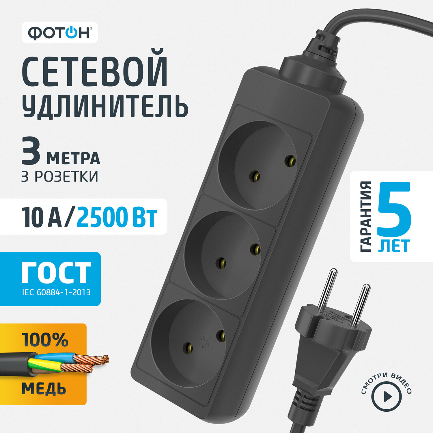 - Удлинитель сетевой "ФОТОН" 10-35S, 3м, 5 розеток
