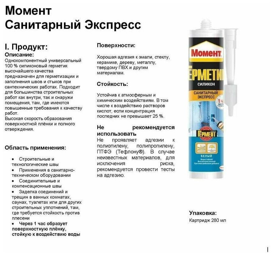 Высококачественный однокомпонентный герметик для герметизации и заполнения швов и стыков в помещениях с повышенной влажностью.
