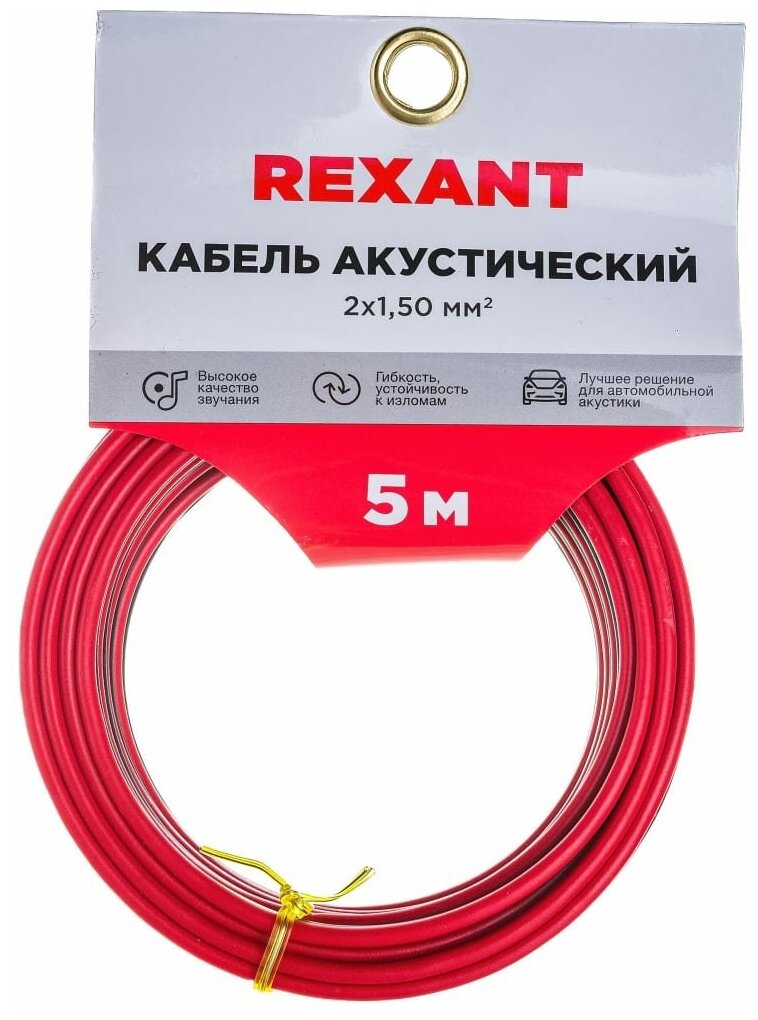 Акустический кабель применяется для подключения звуковых систем и является важным элементом для передачи аудиосигнала. Качественный акустический кабель торговой марки REXANT - залог отличного звука домашней или автомобильной аудиоаппаратуры. Высокое качество изготовления и широкая область применения отличает акустический кабель торговой марки REXANT. Отличное сочетание цены и качества этой продукции порадует любого аудио любителя, цель которого - получить чистый звук по выгодной цене. Акустический кабель 2х1,50 мм? REXANT состоит из двух параллельных многожильных проводников в изоляции из поливинилхлоридного пластиката красного и черного цвета. Разделительное основание позволяет обеспечить разделение проводников кабеля без повреждения изоляции и оголения жил. Длина кабеля 5 метров.
