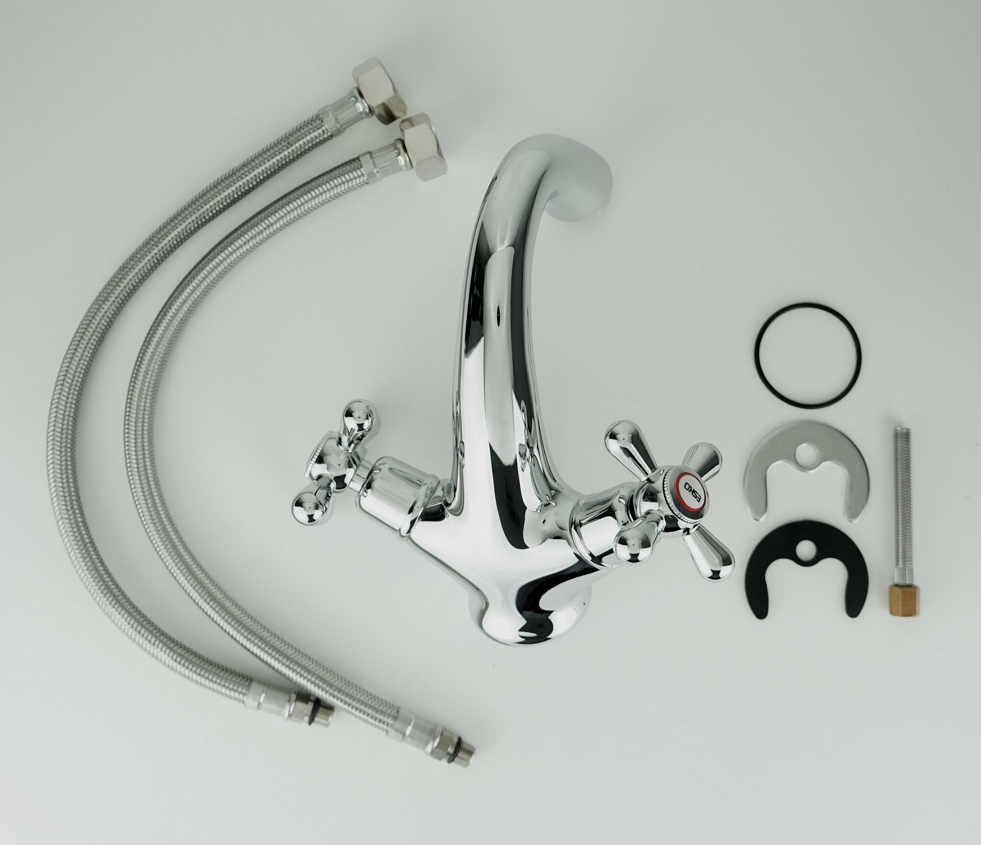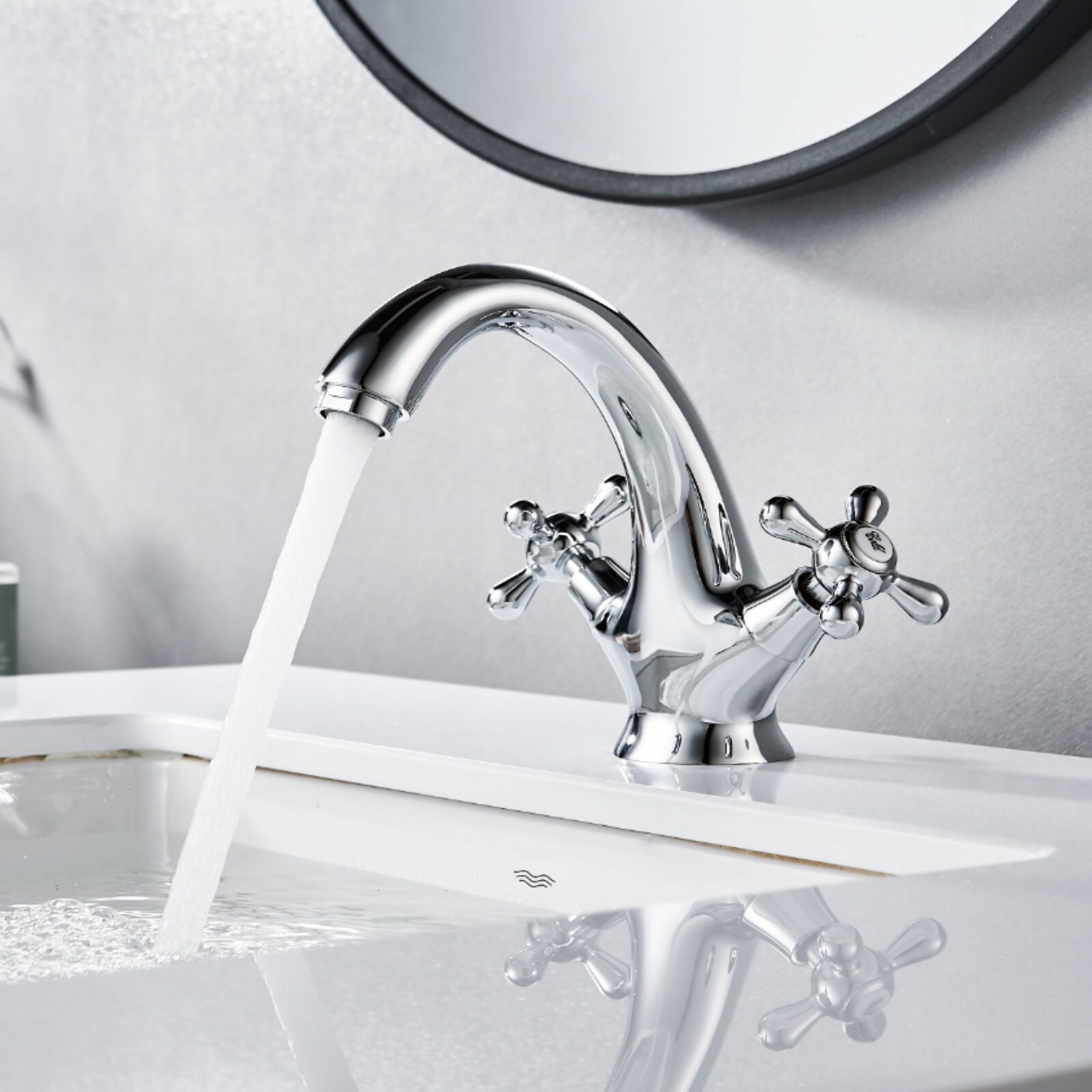 Смеситель для раковины предназначен для подачи горячей и холодной воды в ванных помещениях. Модель оснащена ручками с защитой от нагревания и керамической кран-буксой, обеспечивающей плавный ход вентилей и бесшумное смешивание воды. Изделие выполнено из латуни, отличающейся прочностью, долговечностью и устойчивостью к перепадам температур.
