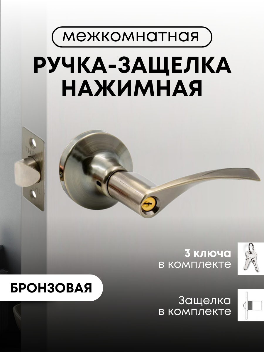 Комплект дверных ручек титан с защелкой (фиксатор+ключи) - полноценное решение для комплектации межкомнатных дверей (от 35 до 45 мм толщина полотна), диаметр розетки стандартный - 65 мм. В комплектации 3 английских ключа. С одной стороны отверстие под ключ, с другой стороны фиксатор (поворотник). Дверные ручки с замком универсальные, подходят на левые и правые двери, можно менять стороны ручки при установке. Ручка дверная межкомнатная имеет высокий ресурс работы: более 300 000 рабочих циклов. Бэксет (удаление ключевого отверстия) защелки регулируется - 60/70 мм. Межкомнатные ручки выполнены из легких современных сплавов, покрыты гальваническим способом в 5 слоев. Данный метод покрытия предотвращает коррозию и защищает от воздействия влаги, поэтому ручки титан можно использовать в помещениях с высокой влажностью (например, ванные и душевые комнаты). Материал изготовления: основание из стали, ручки из сплава ЦАМ (сплав цинка, алюминия, меди). Плавная работа пружины и бесшумный механизм гарантирует качественное открывание и закрывание двери. Гарантия 1 год на весь ассортимент дверных ручек титан.