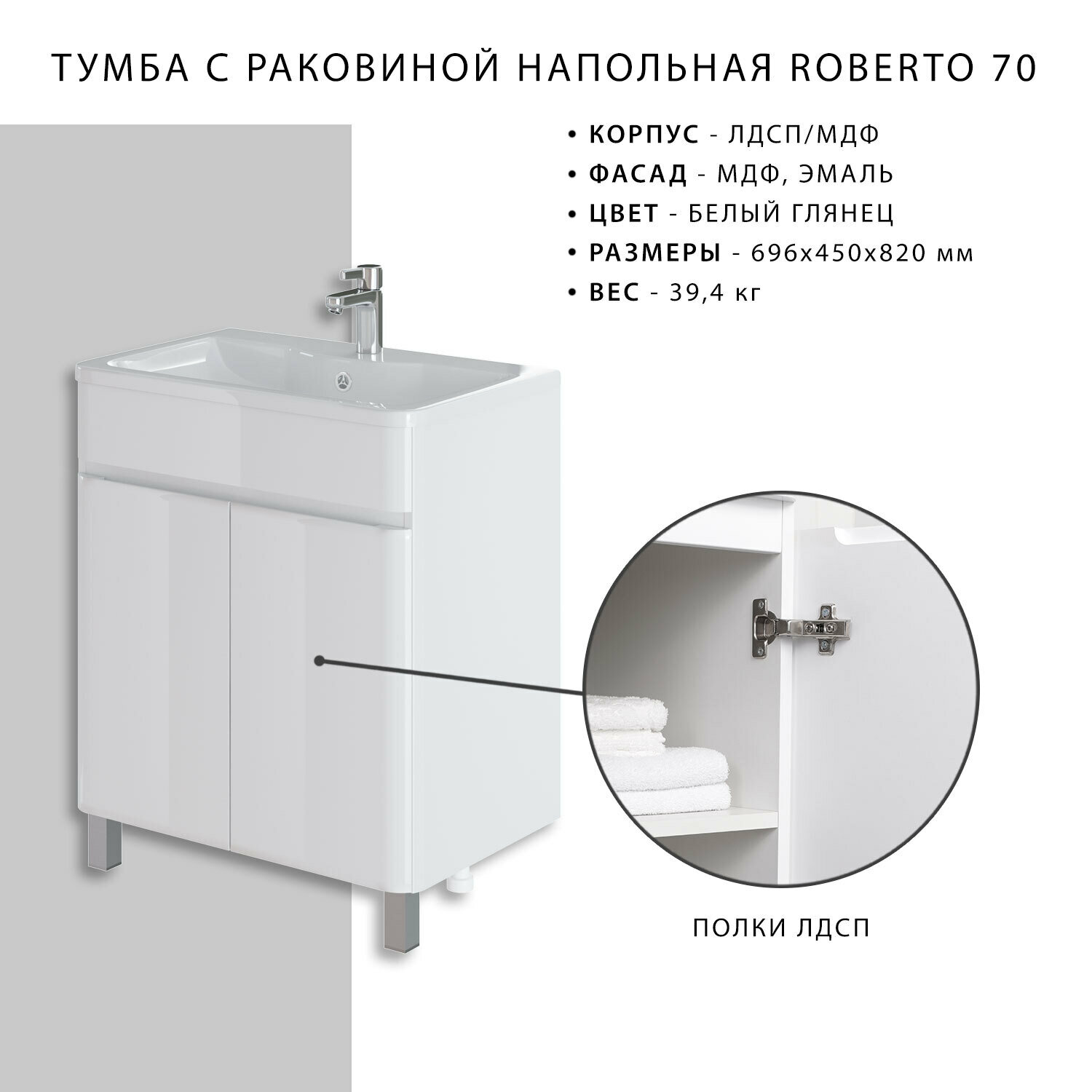 Идеальный белый глянец в сочетании с современным лаконичным дизайном-это коллекция Roberto. Эстетика изящества и минимализма-скругленные фасады, фрезерованные ручки,умывальник из литьевого мрамора,со скругленными углами. Напольная тумба выполнена из влагозащищенного МДФ, покрытого белоснежной глянцевой эмалью. Качественная фурнитура с доводчиками. Плавное и бесшумное открывание и закрывание дверок. Умывальник из литьевого мрамора закрывает корпус тумбы, что обеспечивает дополнительную защиту от воды. За распашными фасадами вы сможете разместить средства бытовой химии. Изысканность,простота и гармоничность-все сошлось в этой прекрасной коллекции!