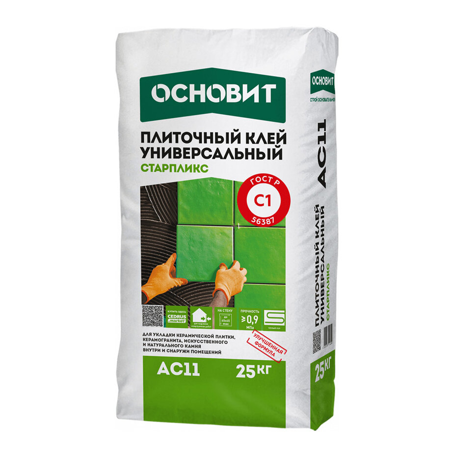 Универсальный плиточный клей основит старпликс АC11 предназначен для облицовки оснований стен и полов с подогревом керамической плиткой, натуральным и искусственным камнем весом до 600 г/100 см². Подходит для внутренних и наружных работ.