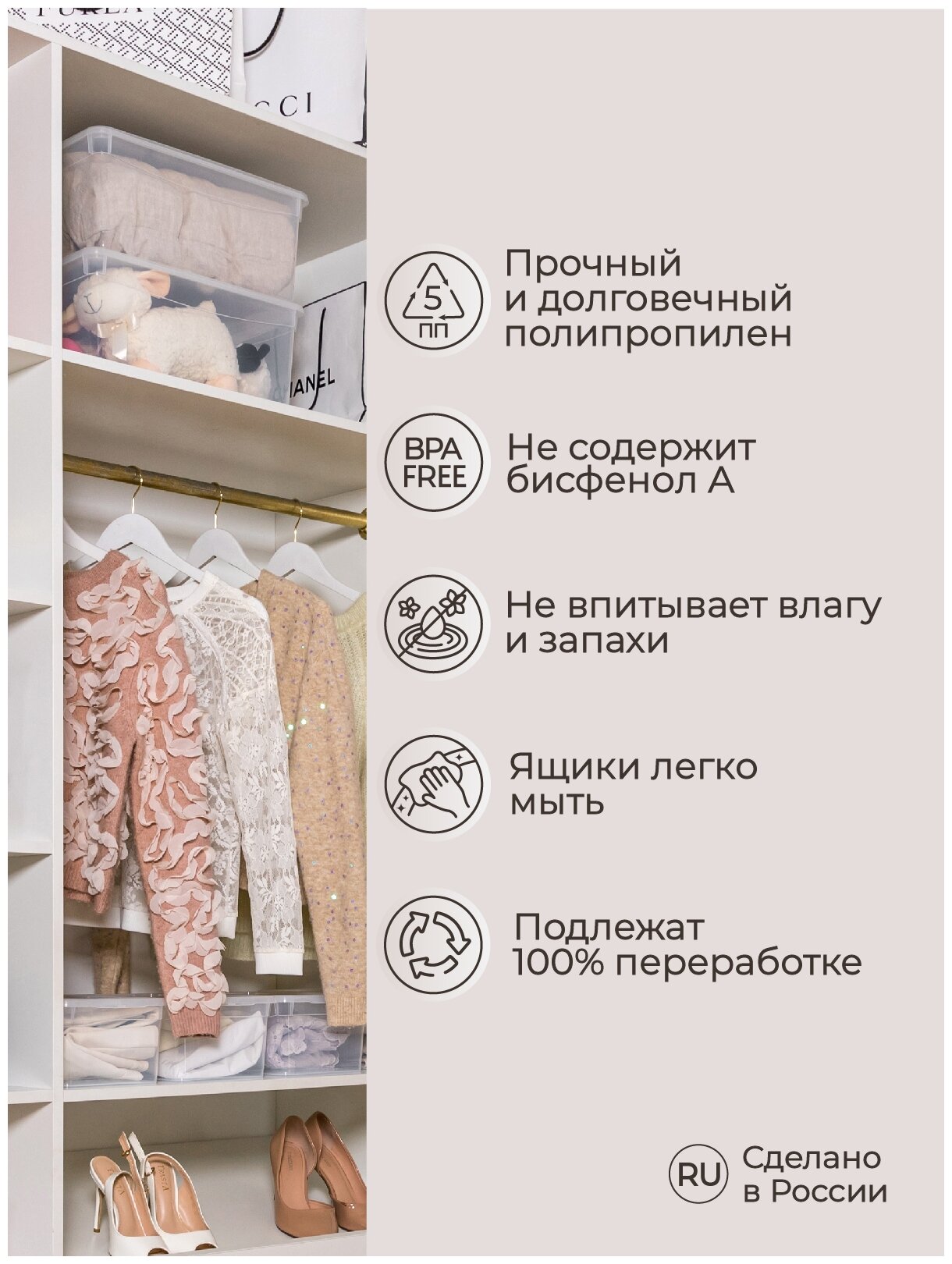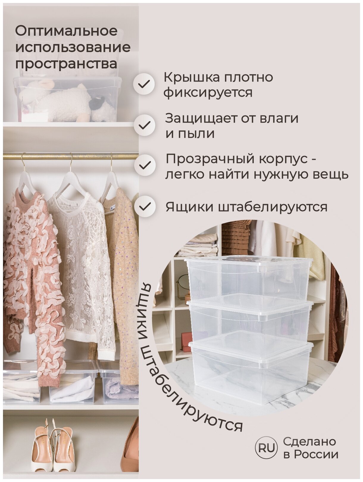 Универсальные ящики 3 шт. «Кристалл» 18 литров, ДлхШхВ 40х33,5х17 см. - 1 шт, помогают рационально организовать пространство и поддерживать идеальный порядок. Крышка плотно фиксируется и защищает содержимое от пыли и влаги. Через прозрачные корпус и крышку ящика видно его содержимое. Хорошо штабелируются. Конструкция ящиков позволяет комбинировать их друг с другом для оптимального использования пространства. Ящики подходят для хранения игрушек, постельного белья, сезонных вещей, одежды и обуви, предметов творчества, повседневных мелочей и т. д. При производстве ящиков используется больше пластика, поэтому ящики этой серии отличаются от аналогов повышенной прочностью. Ящики не имеют острых углов, поэтому их можно использовать даже в детской комнате.