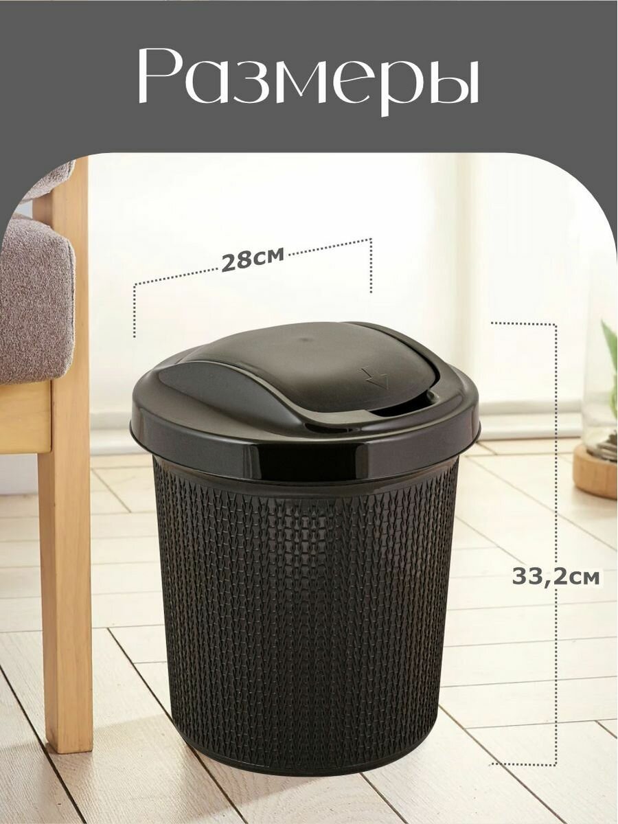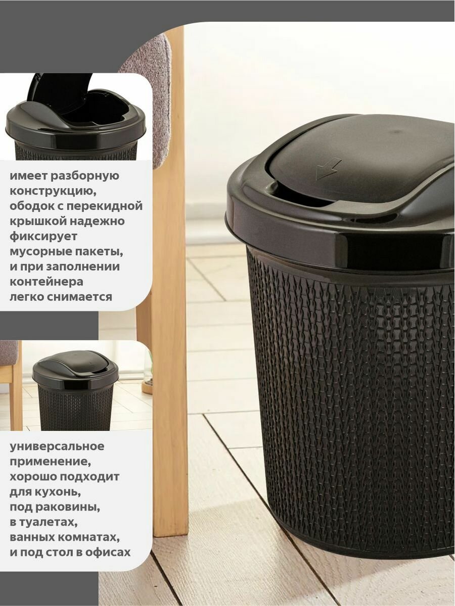 Контейнер для мусора поможет поддержать порядок и чистоту на кухне, в туалетной комнате, за рабочим столом: изделие оснащено крышкой с двойным механизмом открывания, что обеспечивает максимально удобное использование - откидной крышкой можно воспользоваться при забрасывании большого мусора, крышкой-маятником - для мусора меньшего объема. Скрытые борта в корпусе ведра для аккуратного использования одноразовых пакетов и сохранения эстетики изделия. Для удобства извлечения накопившегося в ведре мусора его верхняя часть сделана съёмной. Высокое качество используемого материала гарантирует долгий срок эксплуатации.