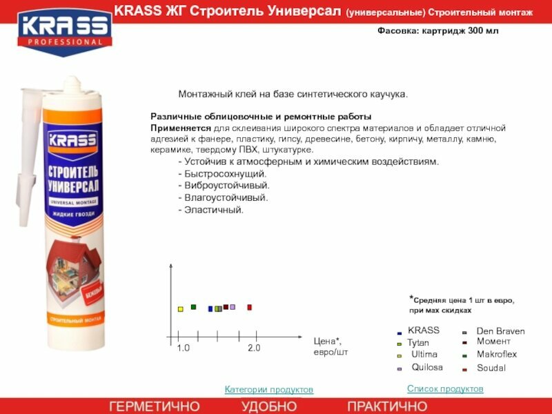 Клей-жидкие гвозди KRASS идеален для впитывающих и невпитывающих поверхностей. Отлично склеивает изделия из гипсокартона, твердого ПВХ, дерева, металла, пластика, ПВХ, ДСП. Незаменим при установке стеновых панелей, молдингов (наличники, плинтуса, фризы, углы), подоконников, оконных и дверных проемов, как при наружных так и при работе внутри помещений. Позволяет корректировать положение приклеиваемых деталей. Обладает высокой силой склеивания. Время склеивания 10 минут. Водостойкий. Эластичен.