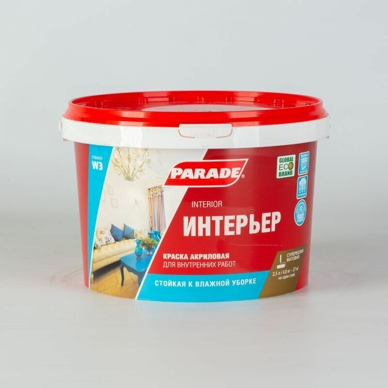 PARADE CLASSIC W3 Интерьер. Влагопрочная краска для стен и потолков на акриловой основе Акриловая белая матовая краска. Обладает отличной укрывистостью. Образует гладкое матовое моющееся покрытие, выдерживающее влажную уборку (на минеральных поверхностях). Устойчивость к влажному истиранию: 3 класс по DIN EN 13300. Долговечность интерьерного покрытия при соблюдении технологии - более 5 лет. Область применения: Для внутренних работ. Для окраски стен и потолков в помещениях, подвергающихся сильным эксплуатационным нагрузкам. Допускается нанесение на поверхности, оклеенные рулонными отделочными материалами (обои под покраску - бумажные, виниловые на бумажной и флизелиновой основе, стеклообои). Типы поверхностей: Бетонные, кирпичные,оштукатуренные, деревянные, цементные, гипсовые и гипсокарто