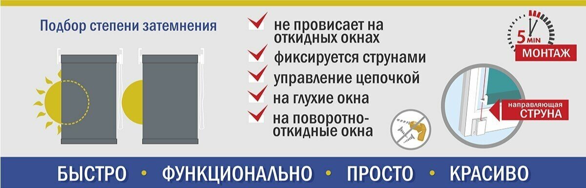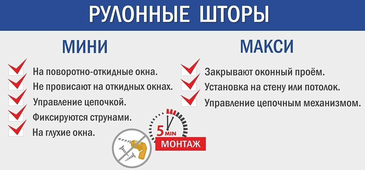Монтаж мини ролло производится непосредственно к оконной створке ,без сверления, на специальных зажимах. Размер шторы подбирается по ширине ткани, которая должна быть на три сантиметра больше ширины стекла.