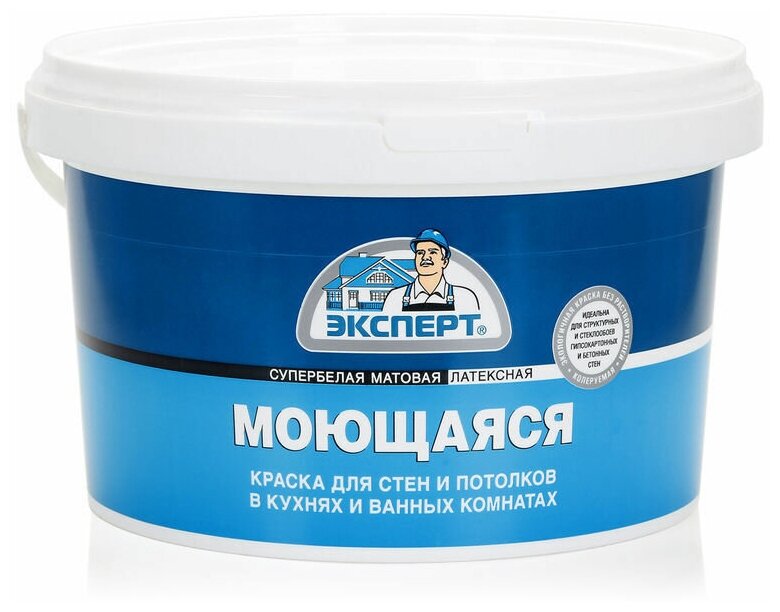 Супербелая матовая водоэмульсионная латексная краска применяется для окраски стен и потолков в кухнях, ванных комнатах и других помещениях с повышенной влажностью. Применяется в качестве краски для обоев, краски по гипсокартону, краски по оштукатуренным и зашпатлеванным поверхностям, краски по бетону, краски по ДСП, ДВП и т.?д. Интерьерная краска идеальна для структурных и стеклообоев, гипсокартонных и бетонных стен. ЭКСПЕРТ моющаяся краска выдерживает влажную уборку с применением неабразивных бытовых моющих средств.