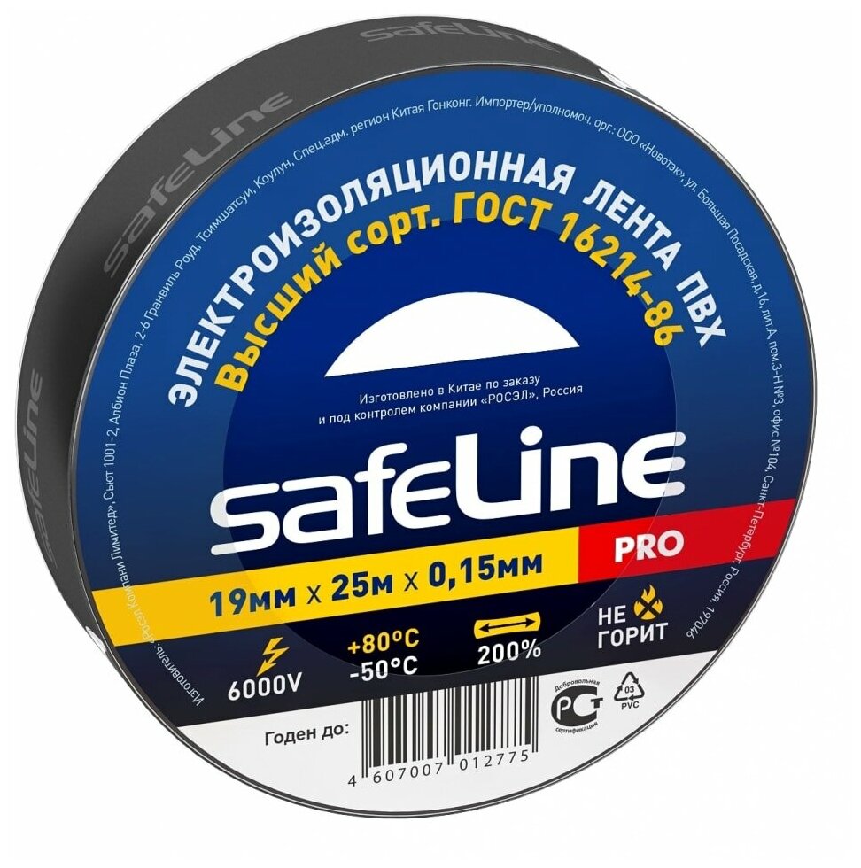 изолента пвх 19мм*25м*015мм черная safeline pro