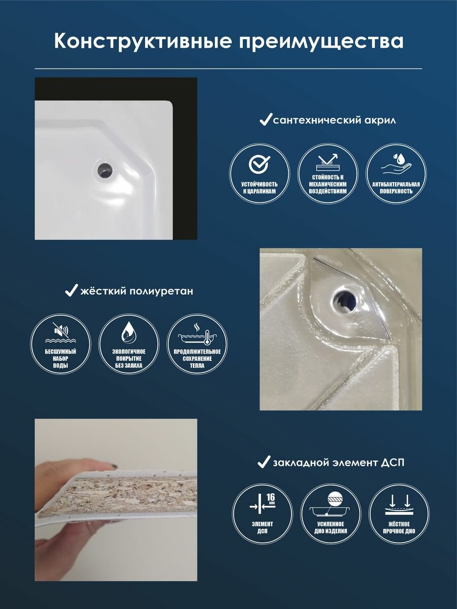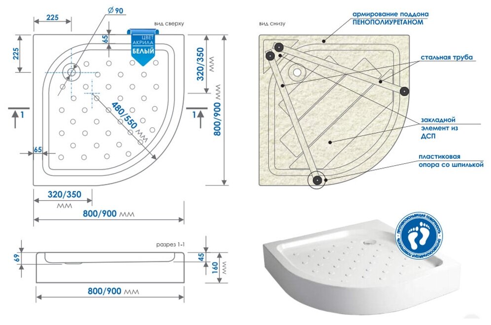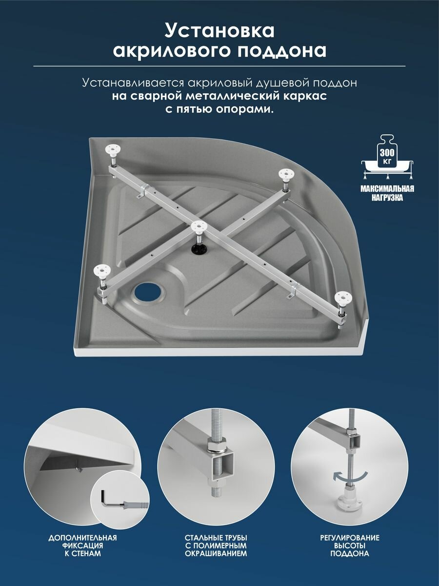 Акриловый душевой поддон полукруглый, углового типа. Ежедневный комфорт. Классическое решение для углового размещения. Устанавливается на сборно-сварной каркас. Оптимальный баланс глубины поддона и ширины слива. Максимальная прочность, выдерживает нагрузку до 300 кг. Бесшумный набор воды. Высокая ударопрочность.