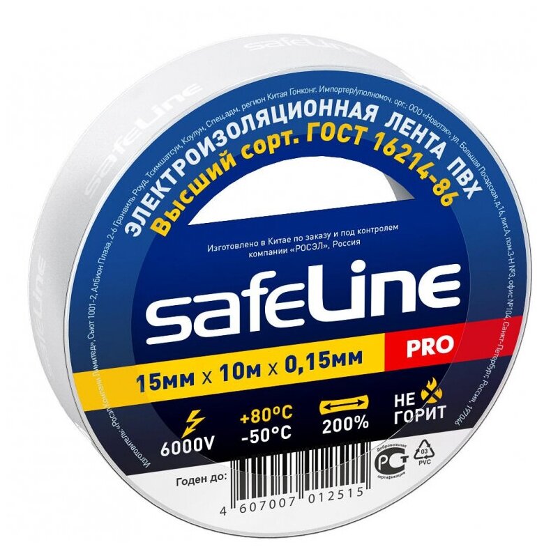 Изоляционная лента Safeline разработана и изготовлена на основе пленки из поливинилхлоридного изоляционного пластиката, используемой в производстве профессиональных изоляционных лент. Специальные добавки, входящие в состав данного материала, повышают эластичные свойства ленты, увеличивают ее долговечность и обеспечивают устойчивость к горению.