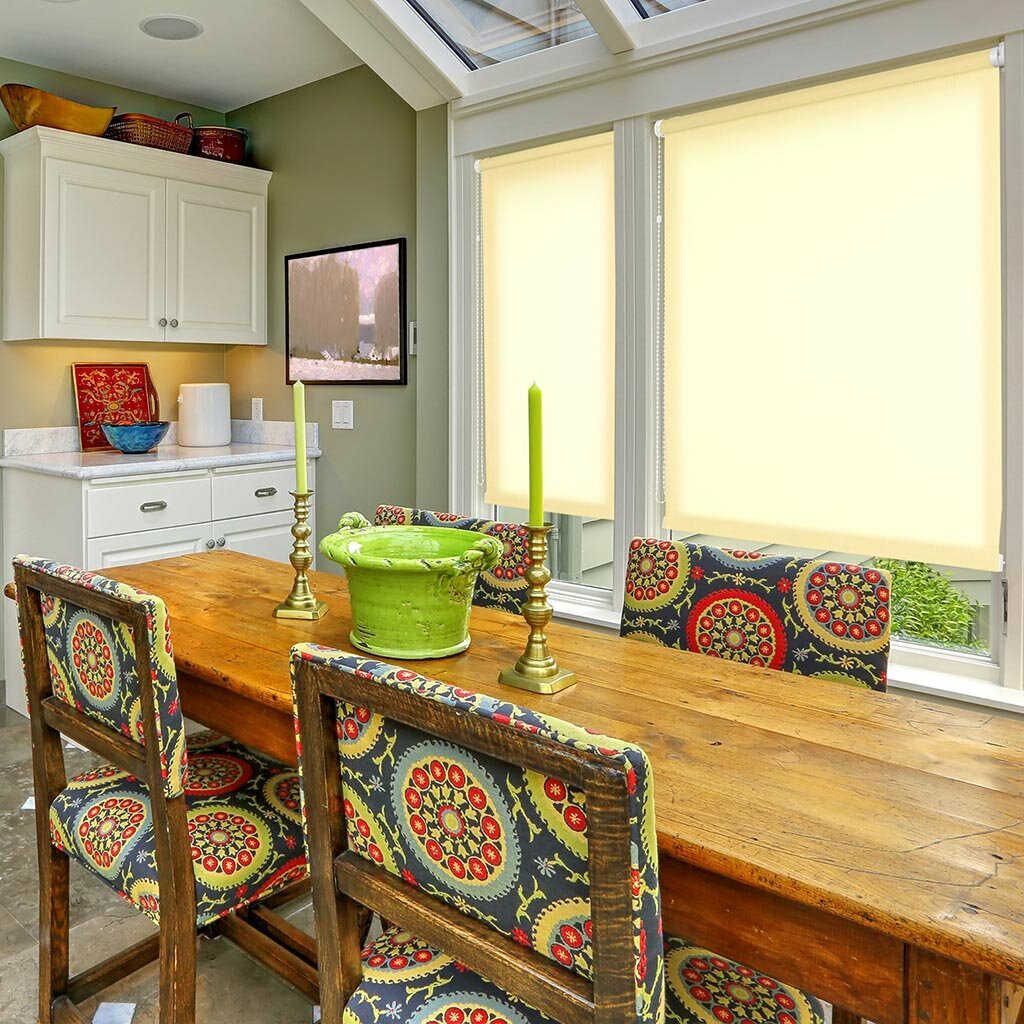 Штора рулонная регулирует освещение комнаты, опускается до любого желаемого уровня.