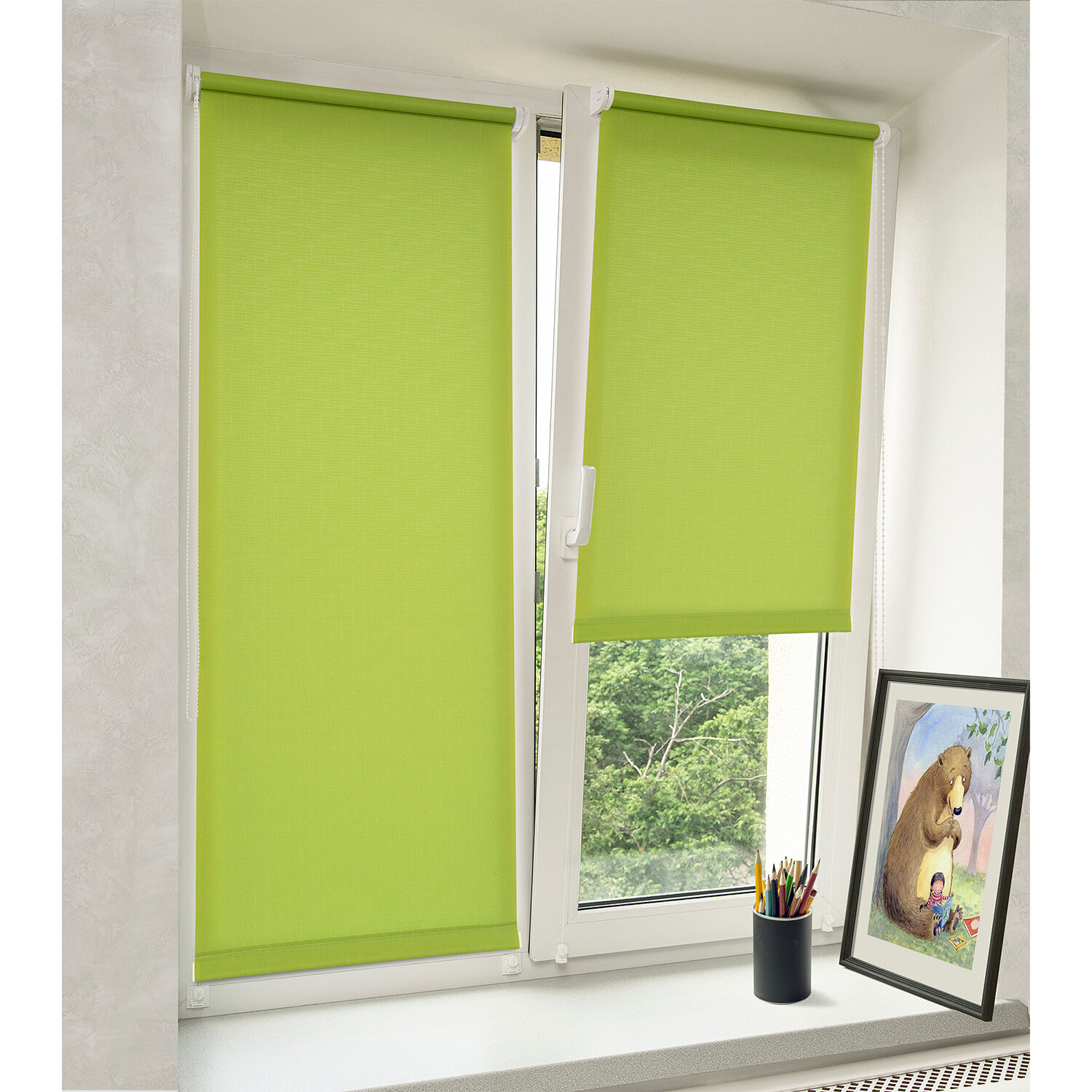 Штора рулонная регулирует освещение комнаты, опускается до любого желаемого уровня.