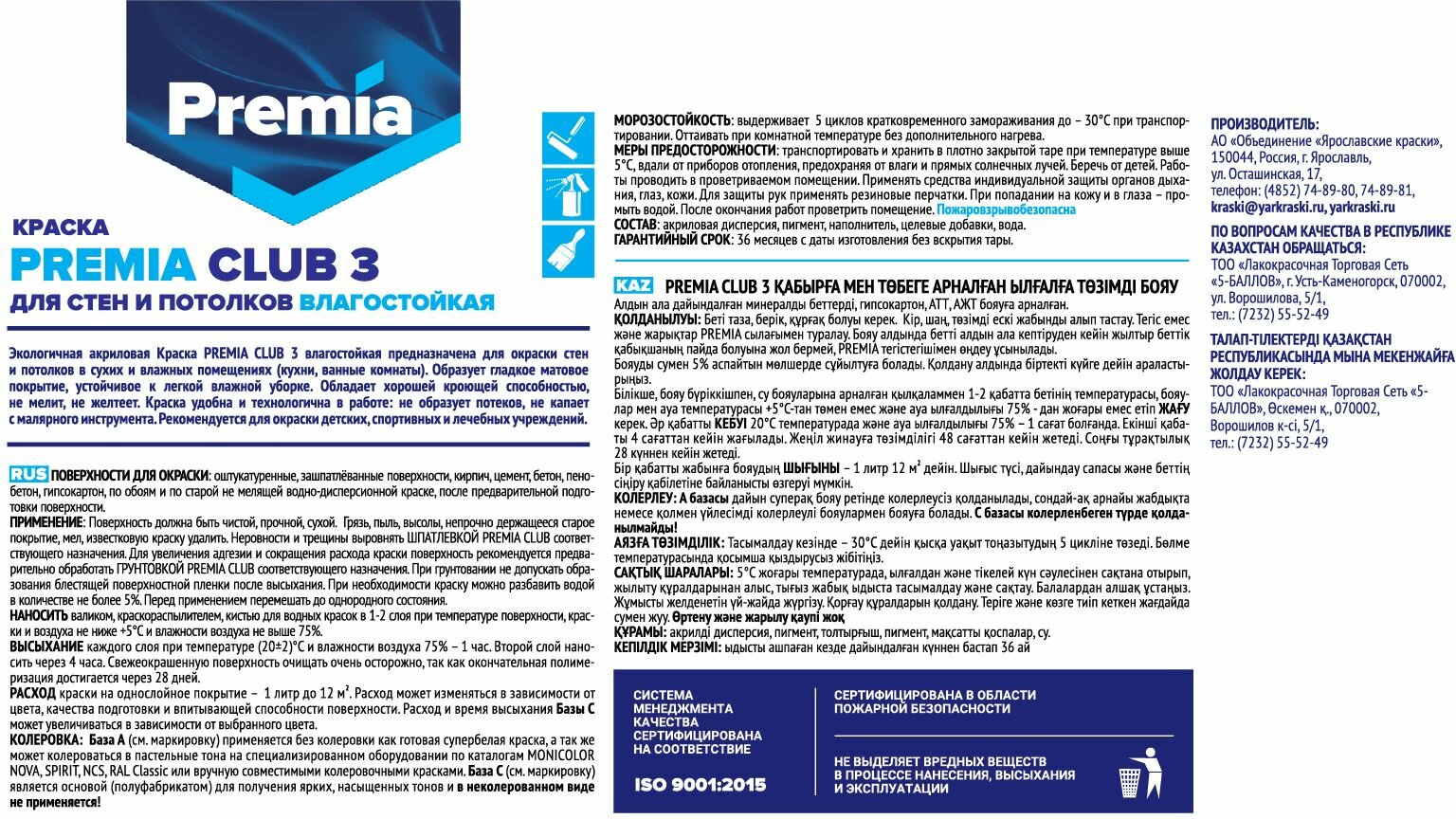 Экологичная акриловая Краска PREMIA CLUB 3 влагостойкая предназначена