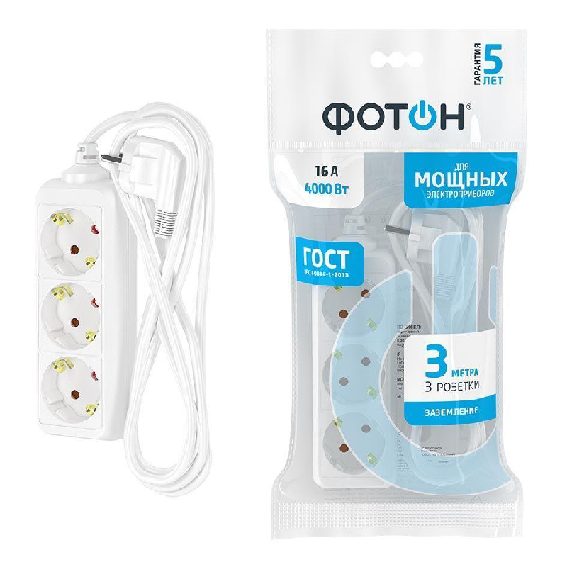 удлинитель сетевой фотон 16-33е 3м 3 розетки 16а с заземл белый