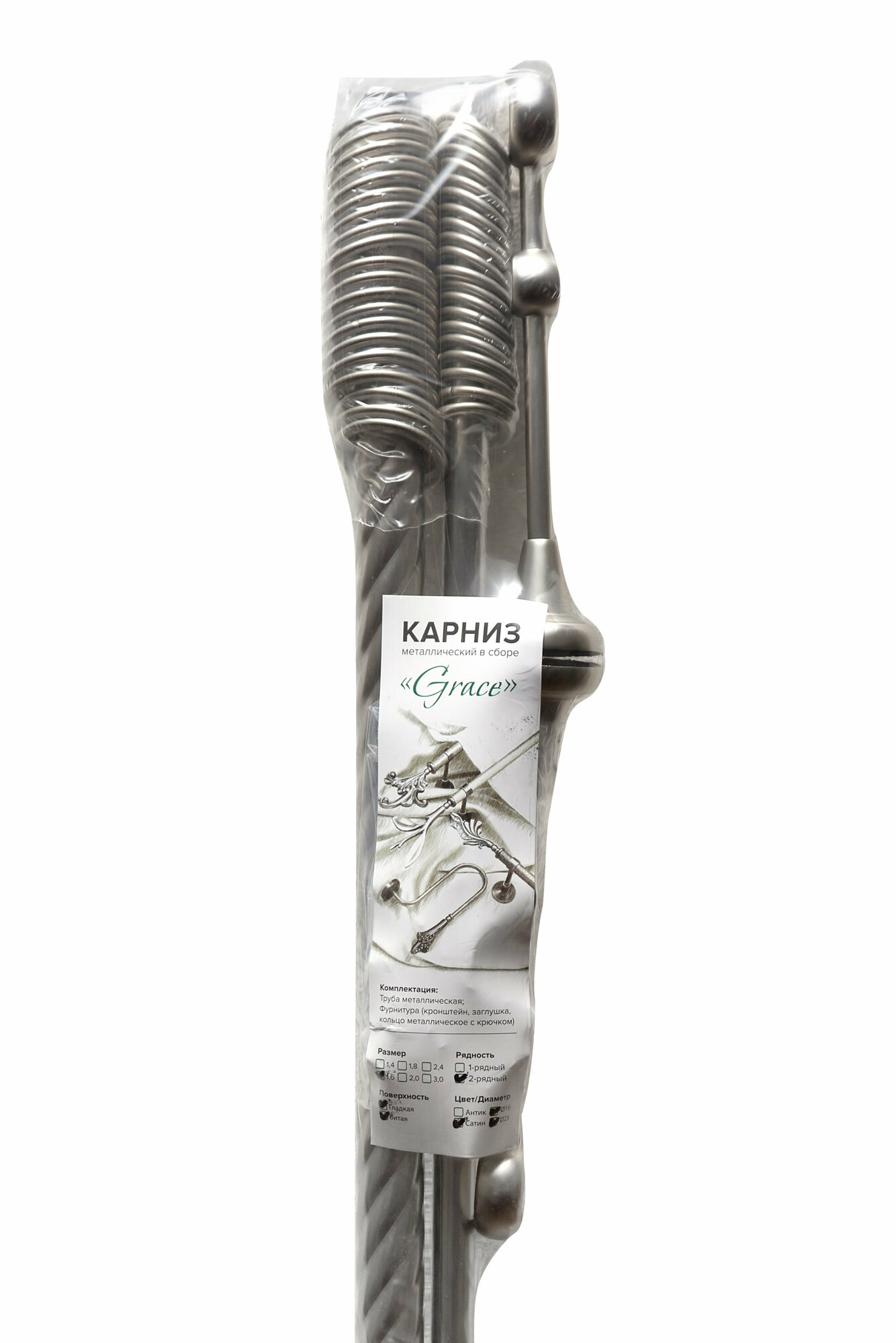 Двухрядный металлический карниз для штор в классическом стиле. Базу карниза составляют крученая и гладкая труба в цвете сатин. Трубы для металлических карнизов выполнены из высококачественной стали с гальваническим покрытием. Диаметр трубы первого ряда - 25 мм, второго ряда - 16 мм и толщина металла 0,6 мм обеспечивают карнизу максимальную прочность без создания эффекта утяжеления. В комплект входят: труба - 2 шт, настенный кронштейн - 2 шт, кольцо бесшумное с крючком ? 10 шт. на м.п., фурнитура для крепления кронштейнов, заглушки для второго ряда. Карнизы Grace универсальны, они подходят для офорления окна тяжелыми портьерами и легким тюлем. Карниз можно дополнить стильными наконечниками (приобретаются отдельно). Модели в классическом, современном стиле - широкий выбор позволяет вписать карниз в любой интерьер.
