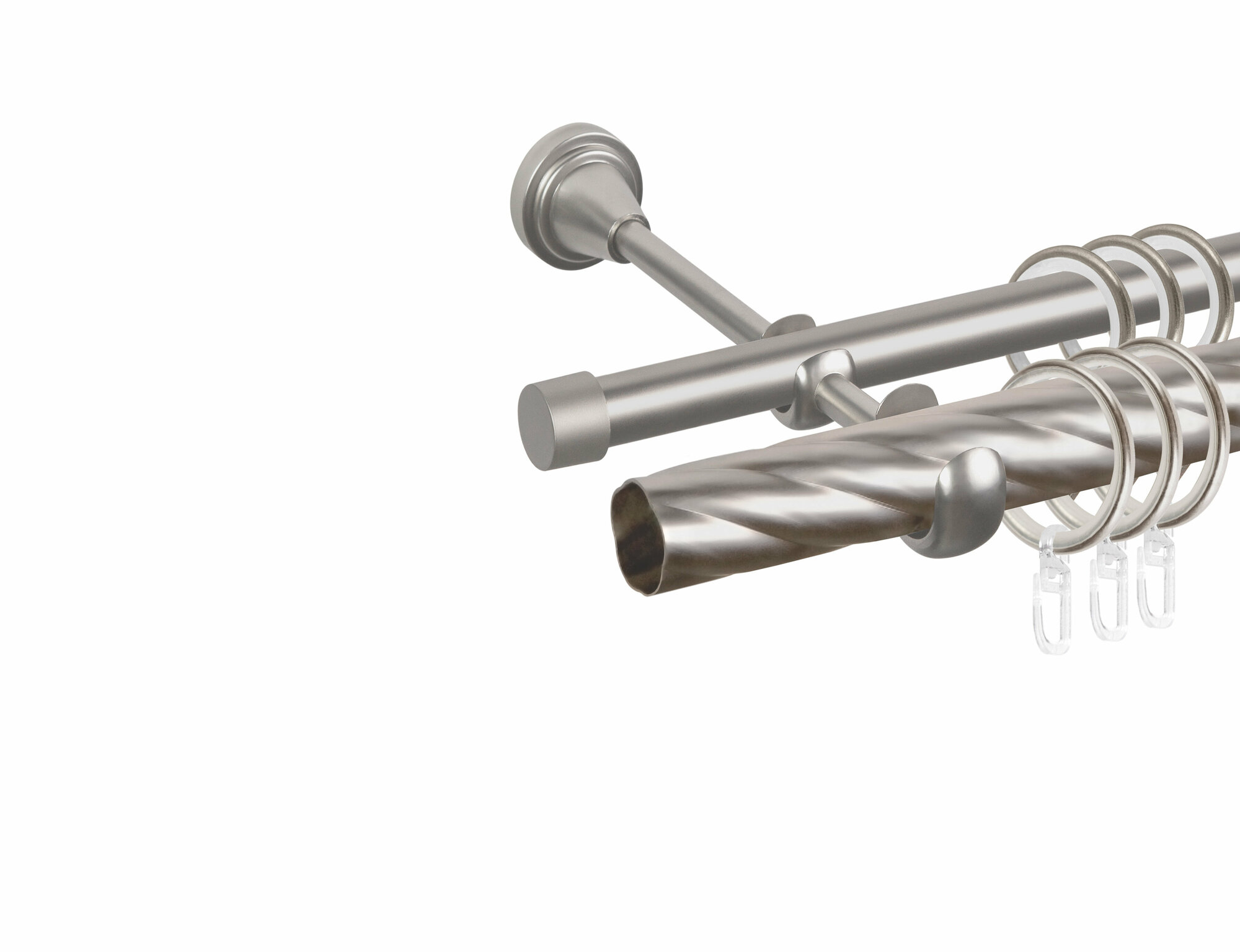 Двухрядный металлический карниз для штор в классическом стиле. Базу карниза составляют крученая и гладкая труба в цвете сатин. Трубы для металлических карнизов выполнены из высококачественной стали с гальваническим покрытием. Диаметр трубы первого ряда - 25 мм, второго ряда - 16 мм и толщина металла 0,6 мм обеспечивают карнизу максимальную прочность без создания эффекта утяжеления. В комплект входят: труба - 2 шт, настенный кронштейн - 3 шт, кольцо бесшумное с крючком ? 10 шт. на м.п., фурнитура для крепления кронштейнов, заглушки для второго ряда. Карнизы Grace универсальны, они подходят для офорления окна тяжелыми портьерами и легким тюлем. Карниз можно дополнить стильными наконечниками (приобретаются отдельно). Модели в классическом, современном стиле - широкий выбор позволяет вписать карниз в любой интерьер.