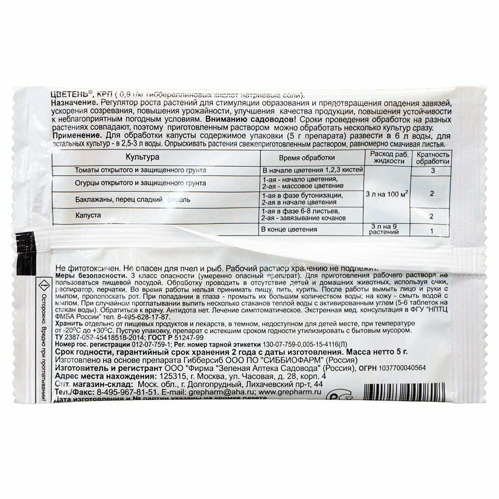 | Состав | 0,9 г/кг натриевых солей гиббереллиновых кислот, удобрение с набором питательных элементов |