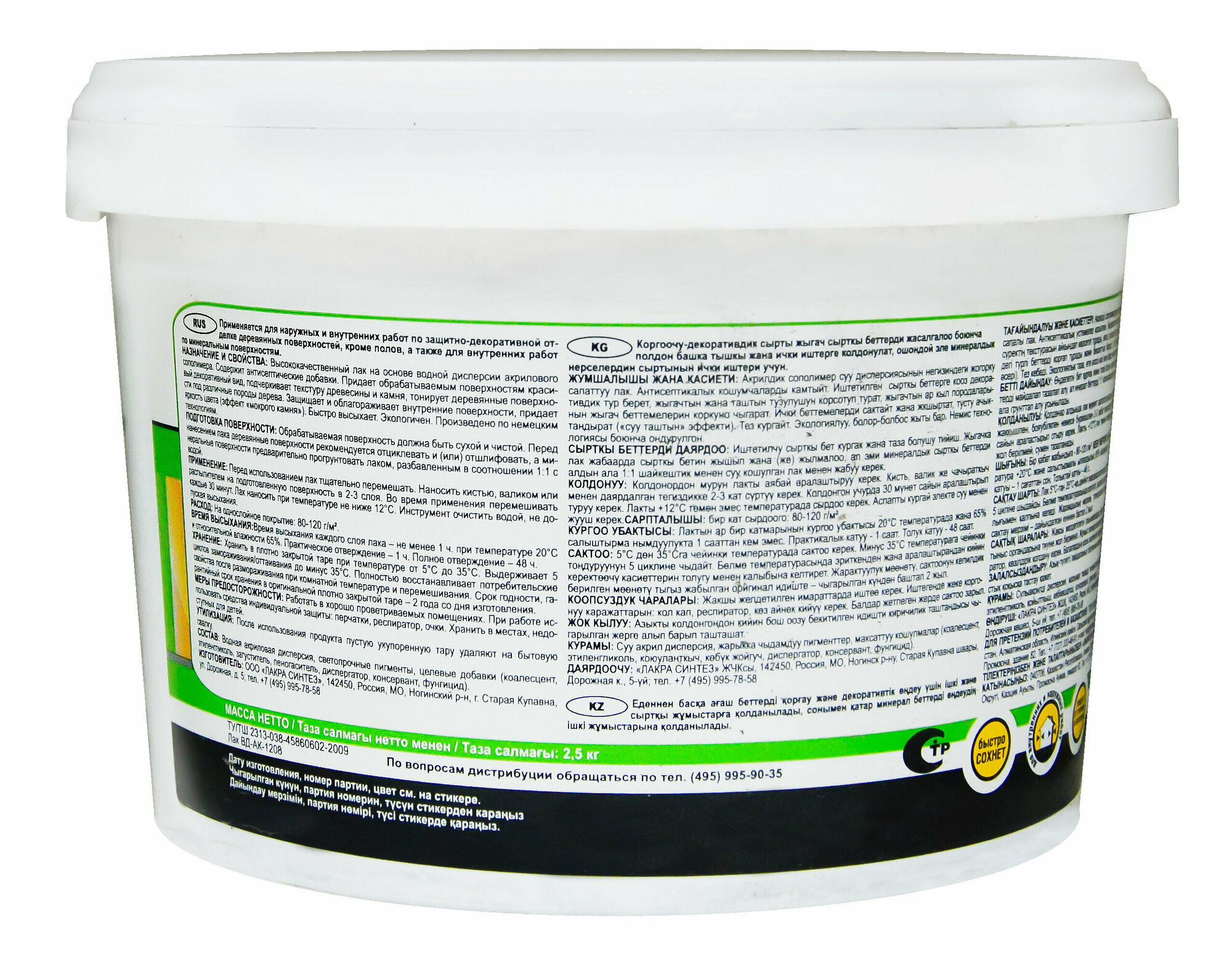 ЛАК ТОНИРОВАННЫЙ АКРИЛОВЫЙ с УФ-фильтром Высококачественный лак на основе водной акриловой дисперсии. Придает деревянным поверхностям красивый декоративный вид. Обладает высокой скоростью высыхания, что дает возможность окрасить поверхность в 2 слоя за одни сутки. Область применения Применяется для наружных и внутренних работ по защитно-декоративной отделке деревянных поверхностей (плинтусов, вагонки, наличника, различных видов панелей), кроме полов, а также для внутренних работ по минеральным поверхностям (кирпич, бетон, керамика, природный камень) Виды работ: для внутренних и наружных работ Время высыхания: Время высыхания каждого слоя лака - не менее 1 ч. Практическое отверждение - 1 ч. Полное отверждение - 48 ч. Минимальная температура нанесения: 12 °C Примерный расход: 8-14 м2/кг