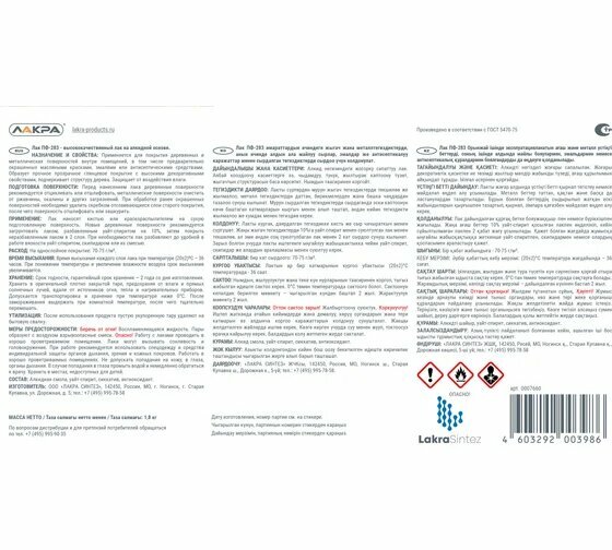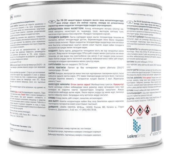 ЛАК алкидный ПФ-283Торговая марка: ЛАКРАПроизводитель: ООО «ЛАКРА СИНТЕЗ»Высококачественный лак на алкидной основе. Образует прочное прозрачное глянцевое покрытие с высокими декоративными свойствами, подчеркивает структуру дерева. Защищает от воздействия влаги.Область примененияПрименяется для покрытия деревянных и металлических поверхностей внутри помещений, в том числе предварительно окрашенных масляными красками, эмалями или антисептическими средствами.Степень глянцаГлянцевый