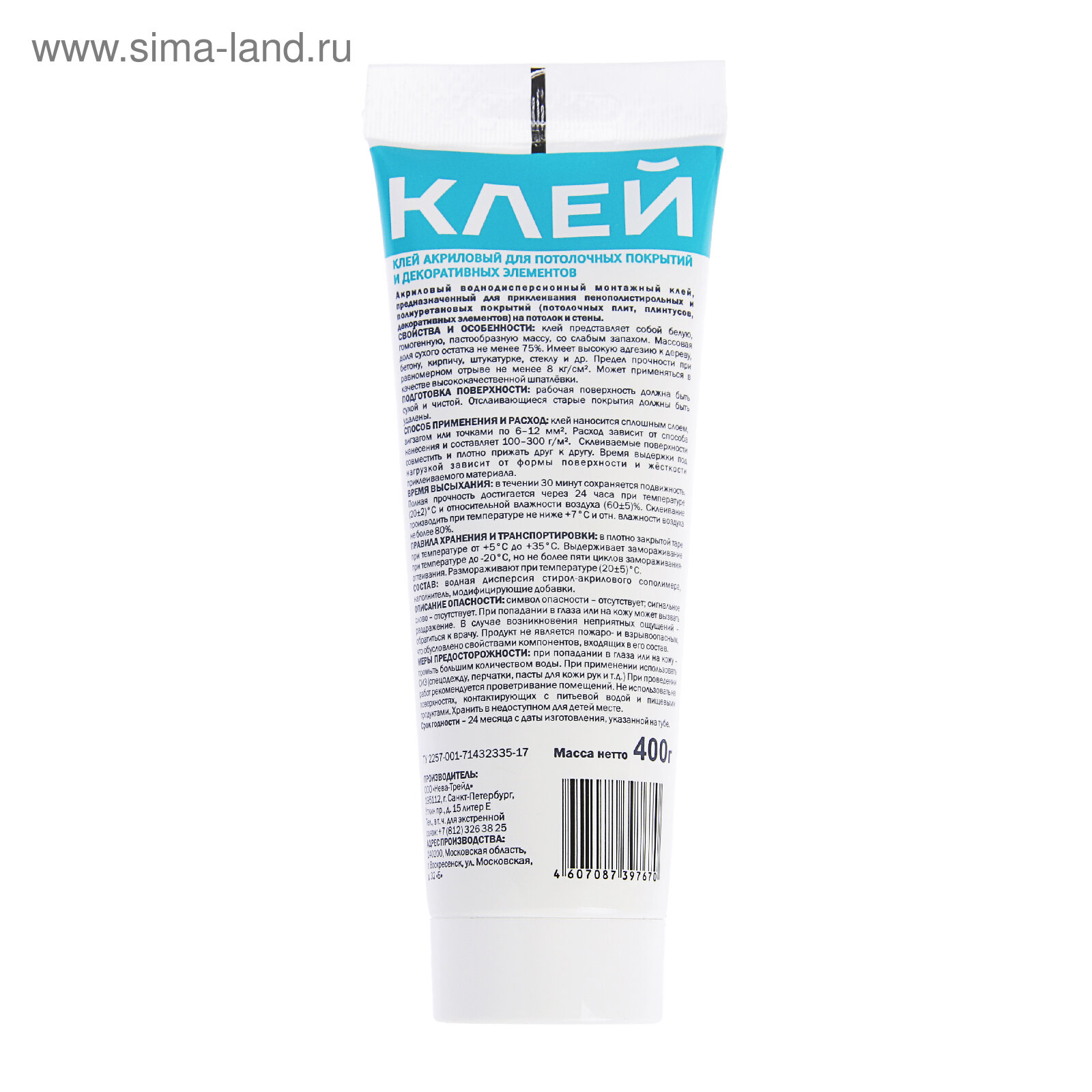 Акриловый воднодисперсионный влагостойкий монтажный клей, предназначенный для приклеивания пенополистирольных и полиуретановых покрытий (потолочных плит, плинтусов, декоративных элементов) на потолок и стены.