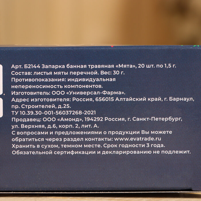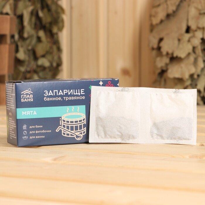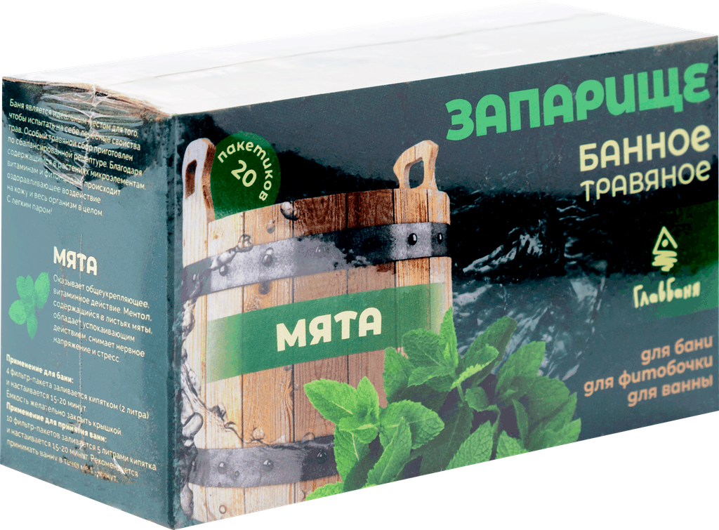 Описание Запарка для бани и сауны Главбаня "Мята" - высушенные и размолотые листья ароматного растения. Горячий пар с мятной запаркой обладает целебным эффектом, убивает бактерии в парной и дезинфицирует кожные покровы. Лечебная трава стимулирует деятельность головного мозга, расширяет сосуды, снимает спазмы, способствует расширению дыхательных путей, применяется при простудных заболеваниях. Использование запарки в бане снимает головные боли, уменьшает отечность, расслабляет, оказывает успокоительное действие, помогает забыть о бессоннице. Настоящие ценители русской бани обязательно оценят аромат и полезные свойства мяты. Запарку рекомендуют подготавливать за 15 минут до принятия ванны или бани. В емкость с водой (2-5 л) помещается мешочек с травами, закрывается крышкой. Настаивать рекомендуется 15-20 минут. Запарку можно применять для компрессов, ополаскивания тела и волос. Для придания аромата можно полить немного отвара на раскаленные камни. Количество фильтр-пакетиков: 20 шт. Товар сертифицирован.