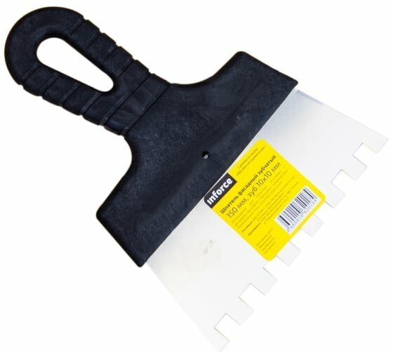 Полотно шпателя изготовлено из нержавеющей стали. Оснащен эргономичной пластмассовой ручкой. Шпатель предназначен для нанесения и выравнивания клеевых и строительных смесей при укладке плитки на поверхностях большой площади. Размер инструмента 150 мм, зуб 10 х 10 мм.