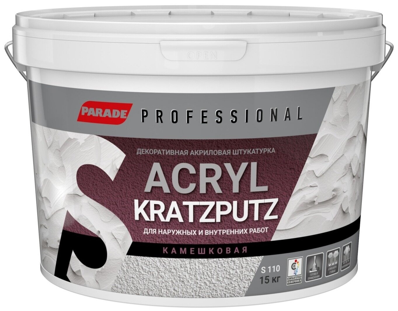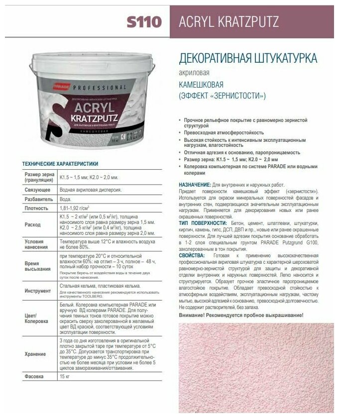 Готовая к применению высококачественная профессиональная акриловая штукатурка с характерной шероховатой равномерно-зернистой структурой для защиты и декоративной отделки внутренних и наружных поверхностей. Образует прочное эластичное паропроницаемое влагостойкое покрытие. Обладает превосходной атмосферостойкостью и долговечностью. Стойкое к интенсивным эксплуатационным нагрузкам и мытью. Отличная адгезия к основанию. Не содержит растворителей, без запаха. Легко наносится и структурируется. Размер зерна: K1.5 ~ 1,5 мм;