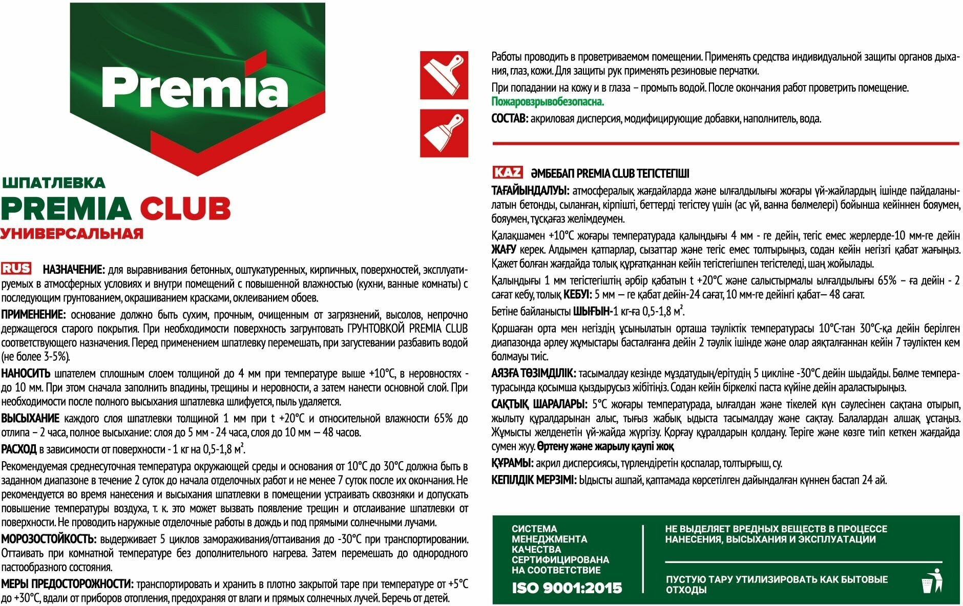шпатлевка premia club универсальная для наружных и внутренних работ 8 кг ЯРКРАСКИ