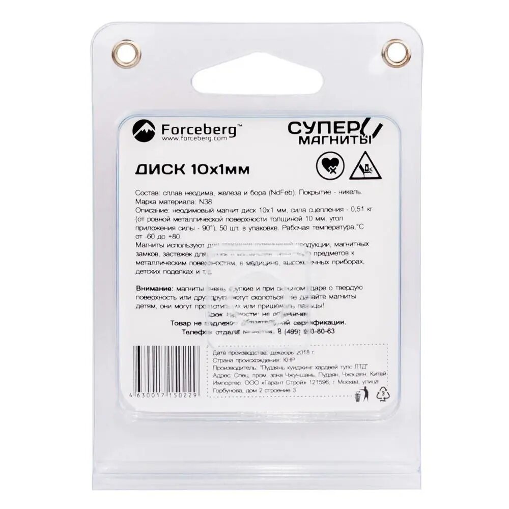 Неодимовые магниты диски 10х1 мм предлагаются с никелированным покрытием в упаковках Forceberg по 50 штук.