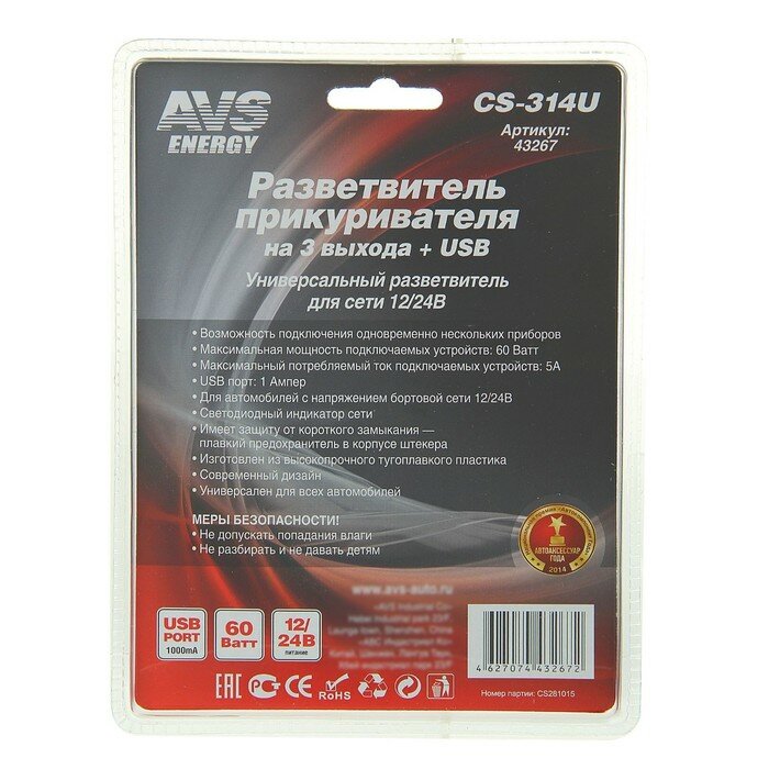 На сегодняшний день товар «разветвитель прикуривателя автомобильный 12/24в (3 выхода) с usb avs cs314u» можно купить с кешбеком в 1 магазине: Яндекс.Маркет