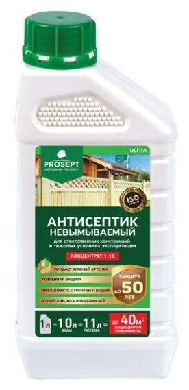 PROSEPT ULTRA ?концентрированный антисептик 1:10 невымываемый для ответственных конструкций в тяжелых условиях эксплуатации. Предназначается для усиленной защиты древесины различных пород в тяжелых условиях эксплуатации ? при длительном контакте с грунтом и прямом воздействии атмосферных осадков. Сфера применения: конструкционные элементы каркасных домов, нижние венцы в домах из бревна или бруса, стропильная система кровли, перекрытия, террасы, заборы, элементы ландшафтного дизайна, садовая мебель, причалы. Обеспечивает защиту от домового грибка, гнили, плесени, насекомых-древоточцев на срок до 50 лет . Нанесение с помощью кисти, валика с синтетическим ворсом или с помощью разбрызгивающего устройства, в 2-3 слоя, с промежуточными сушками по 20-30 минут. Состав: вода, комплекс соединений меди, вспомогательные вещества. Расход рабочего раствора 250 - 350 г/м?