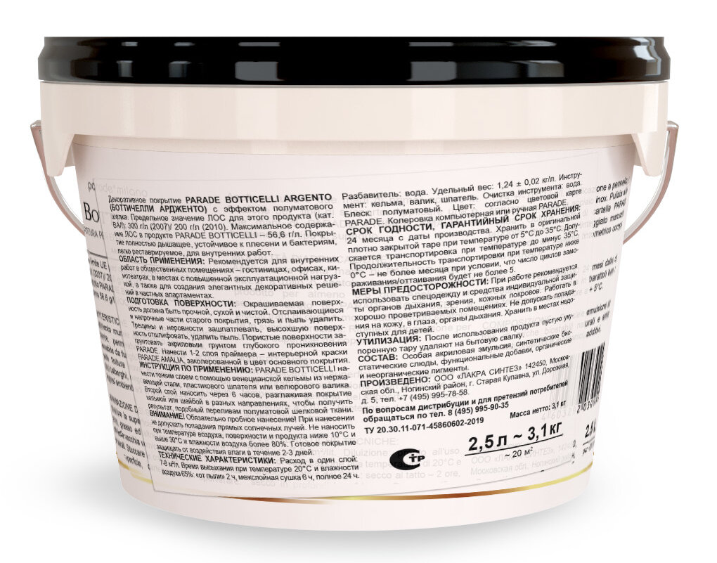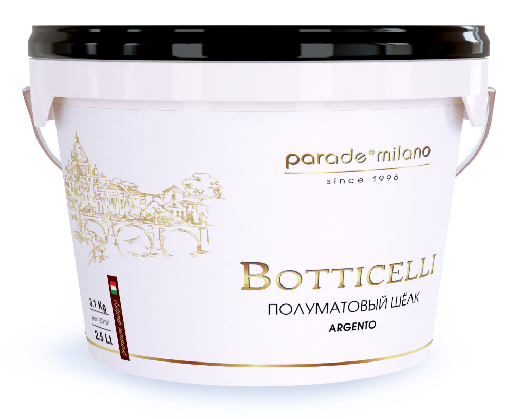 Декоративное покрытие PARADE BOTTICELLI Argento (БОТТИЧЕЛЛИ Ардженто) с эффектом полуматового шелка. Восхитительно деликатные переливы придадут интерьеру элегантность и шарм. Покрытие дышащее, устойчивое к плесени и бактериям, легко реставрируемое, для внутренних работ.