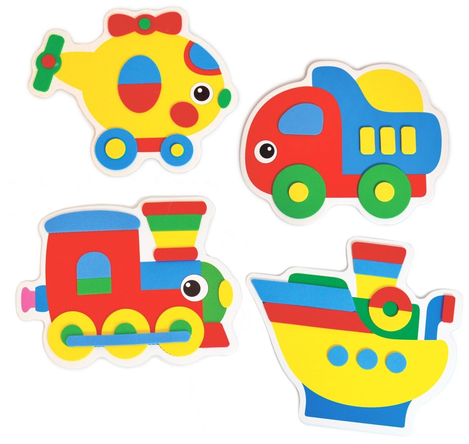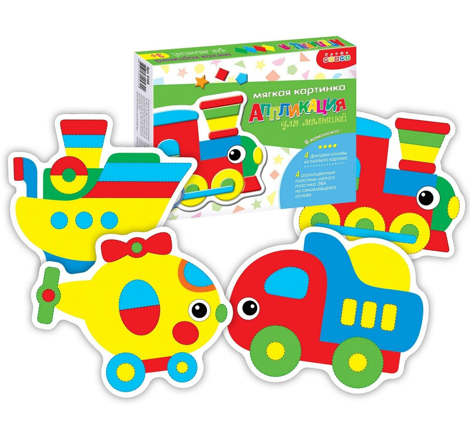 Аппликация - это интересное и полезное занятие для детей разного возраста. В коробке вы найдёте всё для создания замечательных поделок: картонные фигурки четырёх видов транспорта и детали из мягкого пластика на самоклеящейся основе. Мы сделали фигурки и детали крупными специально для детских ручек. Фигурки набора особенно заинтересуют мальчиков. В процессе аппликации развивается мелкая моторика, глазомер и цветовосприятие.