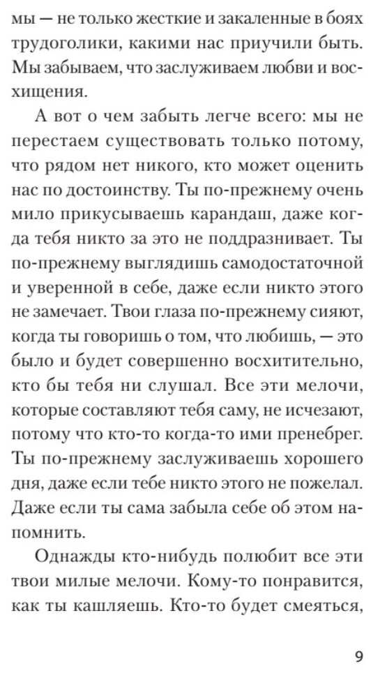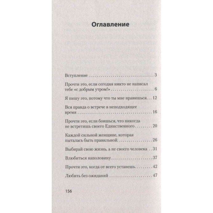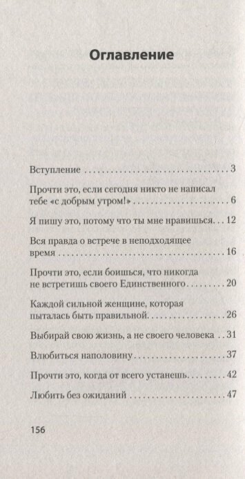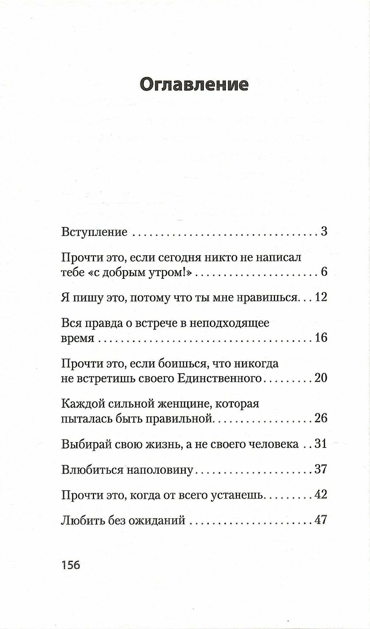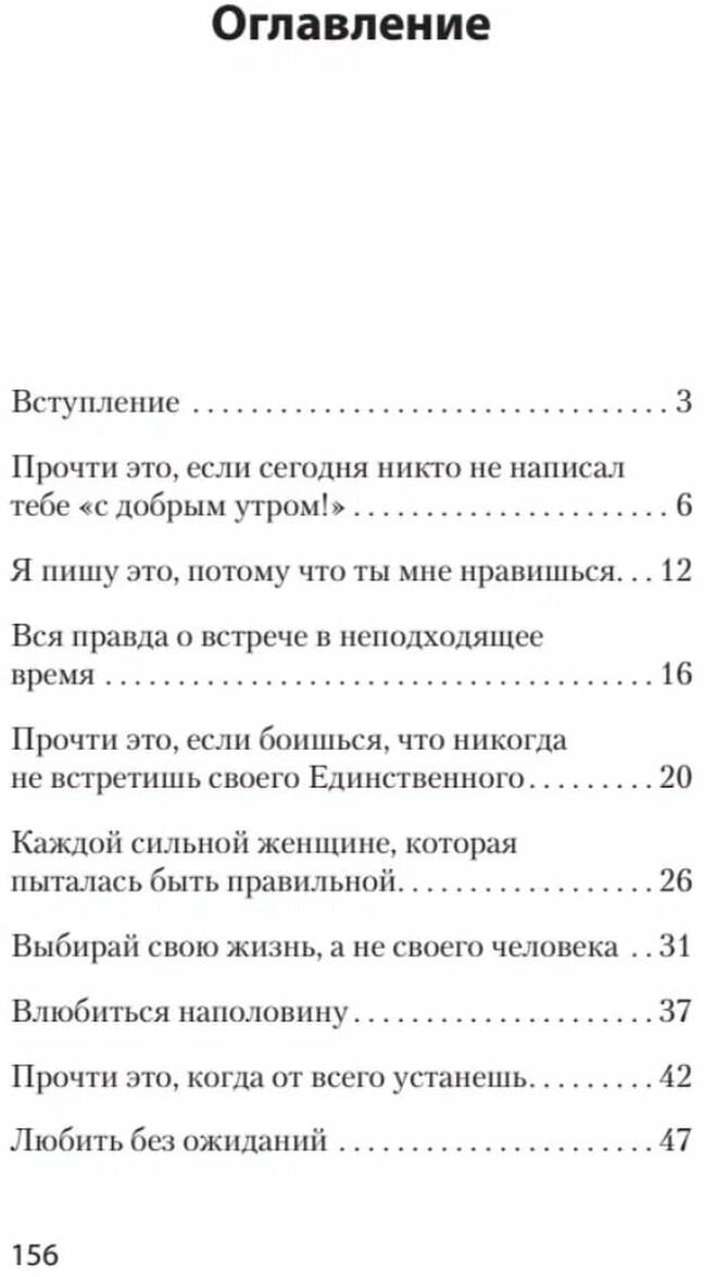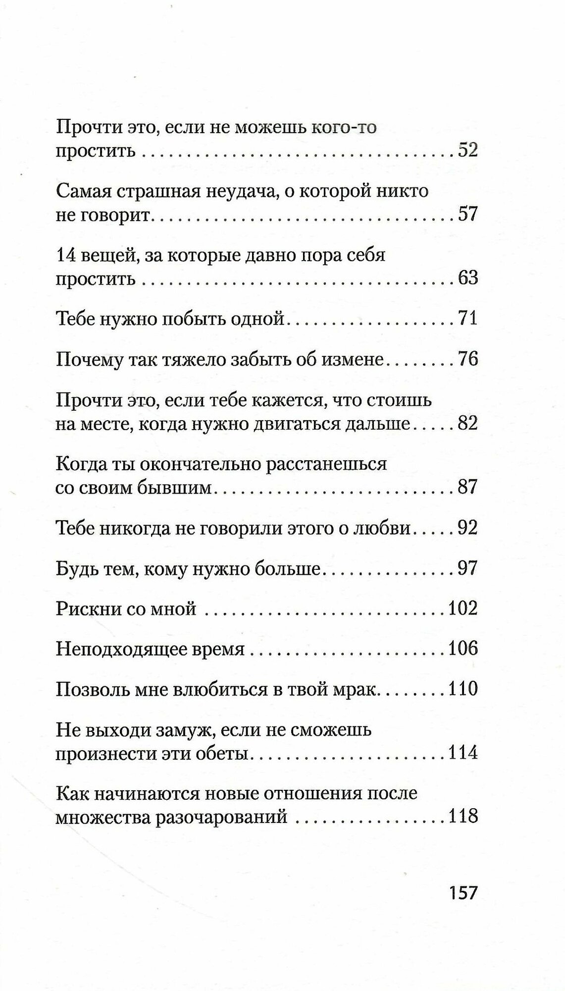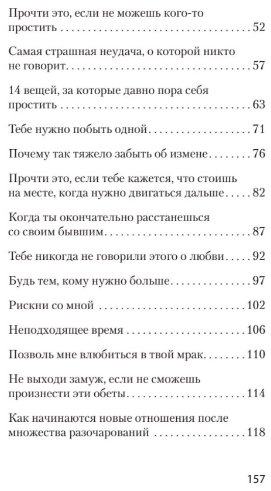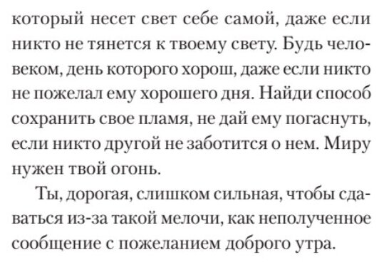 Книга совсем небольшая, прочитала не отрываясь за пару часов. В тексте автор обращается сначала к читательнице, поднимая ее самооценку и поддерживая в сложной ситуации, а затем обращается к мужчине, которого хочется отпустить и забыть. Здесь нет места обесцениванию и осуждению, мести и злости. Здесь непреложные истины, которые мы, под ослепляющими нас эмоциями, часто забываем и причиняем боль себе и близким. Но нет ничего невозможного для того, кто ценит и любит себя, и любой разрыв можно обернуть в пользу для себя.