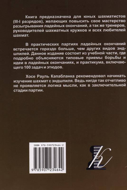 Ладейные окончания — это самый распространенный, самый сложный и самый изученный тип окончаний. Все фигуры в начале игры вступают в схватку, меняются, а ладье для этого требуется намного больше времени. Тему ладейный окончаний, видимо, исчерпать нельзя. Данная брошюра является неплохим сборником интересных позиций из разных классических работ вроде учебника Дворецкого и так далее, но при этом авторы постарались, кроме качественной подборки материала, внести и свои комментарии по представленным окончаниям. С удовольствием прорешал все позиции из книги на живой доске.