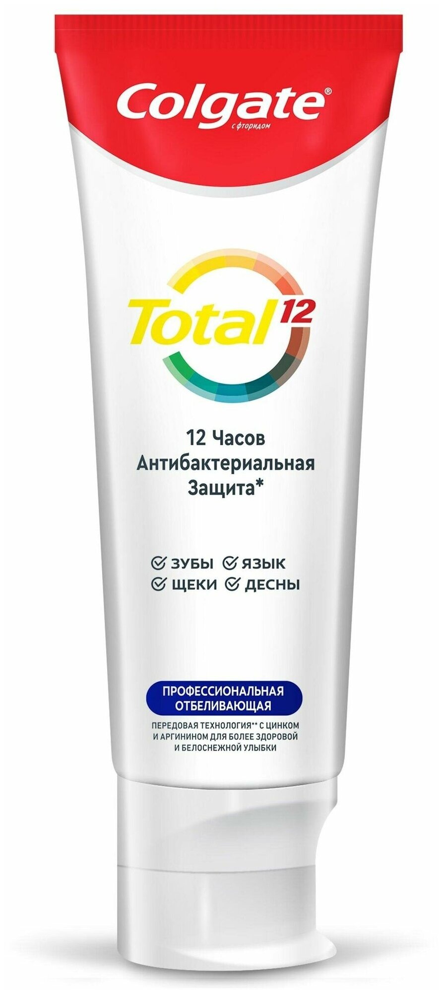 - Colgate Total 12 Профессиональная Отбеливающая ежедневно обеспечивает превосходную защиту от налета, признаков воспаления десен при борьбе с бактериями, нейтрализацию неприятного запаха изо рта, защиту от разрушения эмали, повышенной чувствительности зубов, кариеса, налета, зубного камня, потемнений на эмали и проблем с деснами