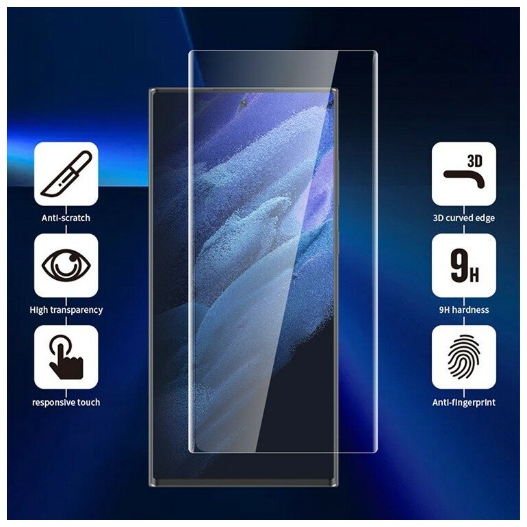 3D Curved Full cover стекло 3D классическое толщиной 0.30mm . Клеевой слой по кромкам. HD, высокая пропускная способность. Работает с сенсором Galaxy S22-series. Поставляется с UV клеем и UV лампой в комплекте.