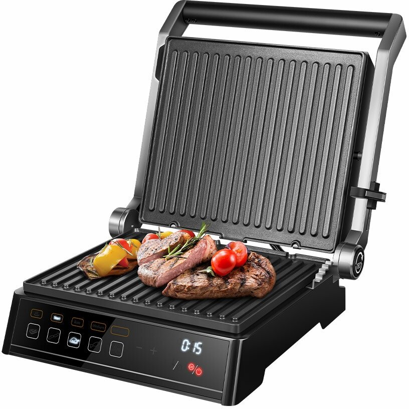 | Функции | термостат / 120 – 230 °С / таймер выключения автоприготовление / 5 программ / съемные пластины подстройка по высоте (шарнир) регулировка высоты верхней пластины открытие на 180° |